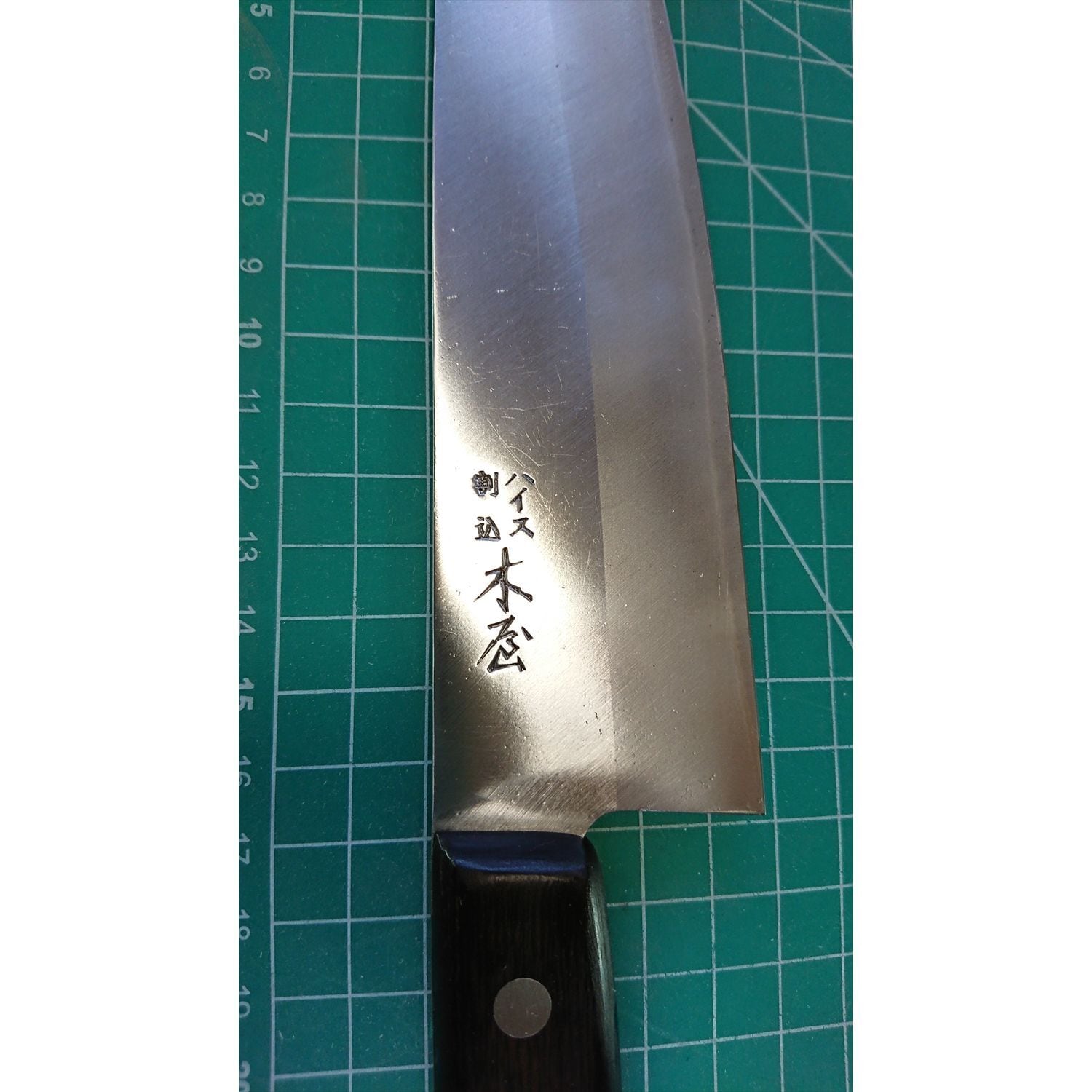 1. o3099/状態:中古/銘:木屋/三徳包丁(両刃 左5:右5 右利き・左利き兼用)/刃長:165/峰厚 アゴ上:1.6/重量:114/作り:ハイス割込(ハイス鋼をステンレスでサンド)/他: