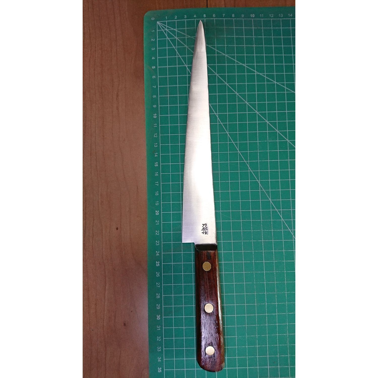 1. o3113/状態:中古/銘:南常/筋引包丁(両刃 約 左1:右9 右利き用)/刃長:230/峰厚 アゴ上:2/重量:138/作り:刀都作 ステンレス系/他:ツバの根元から柄全体にかけて樹脂コーティング済み(防サビの為)