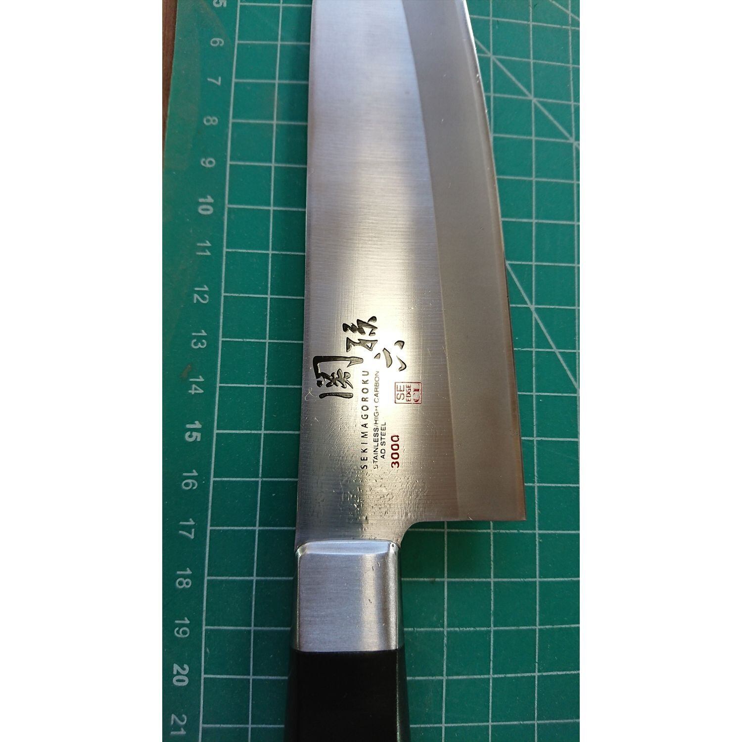 1. o3067/状態:中古/銘:関孫六 3000/三徳包丁(両刃 左5:右5 右利き・左利き兼用)/刃長:165/峰厚 アゴ上:1.9/重量:145/作り:STAINLESS HIGH-CARBON CLAD STEEL/他: