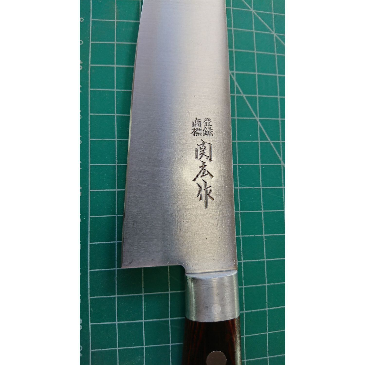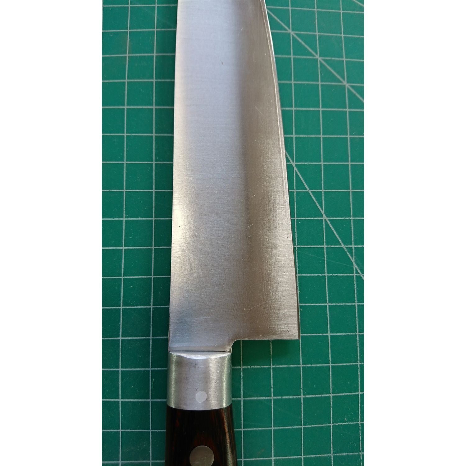 1. o3085/状態:中古/銘:関広/牛刀(両刃 左5:右5 右利き・左利き兼用)/刃長:180/峰厚 アゴ上:1.6/重量:125/作り:割込鋼(鋼をステンレスでサンド)/他: