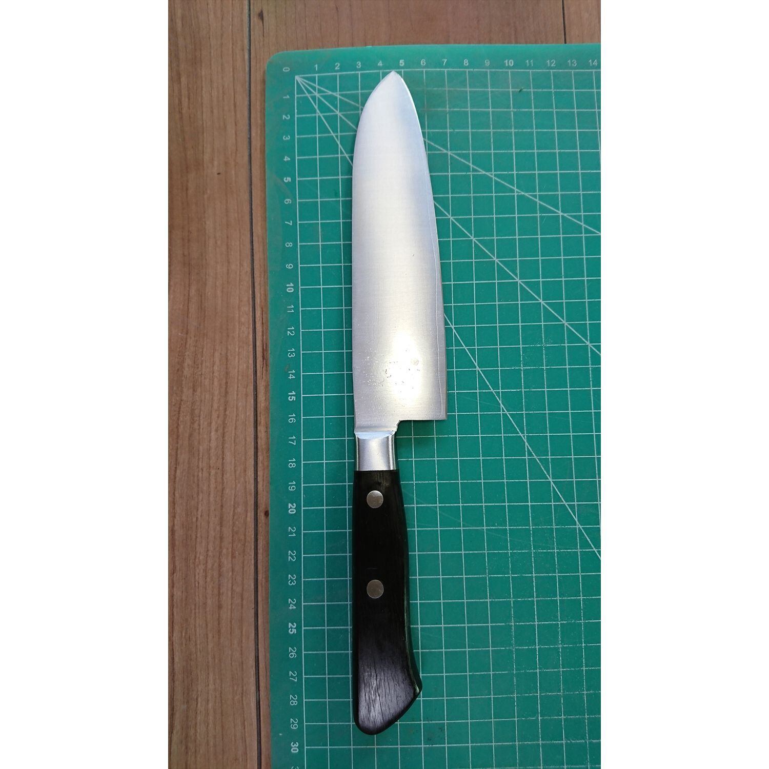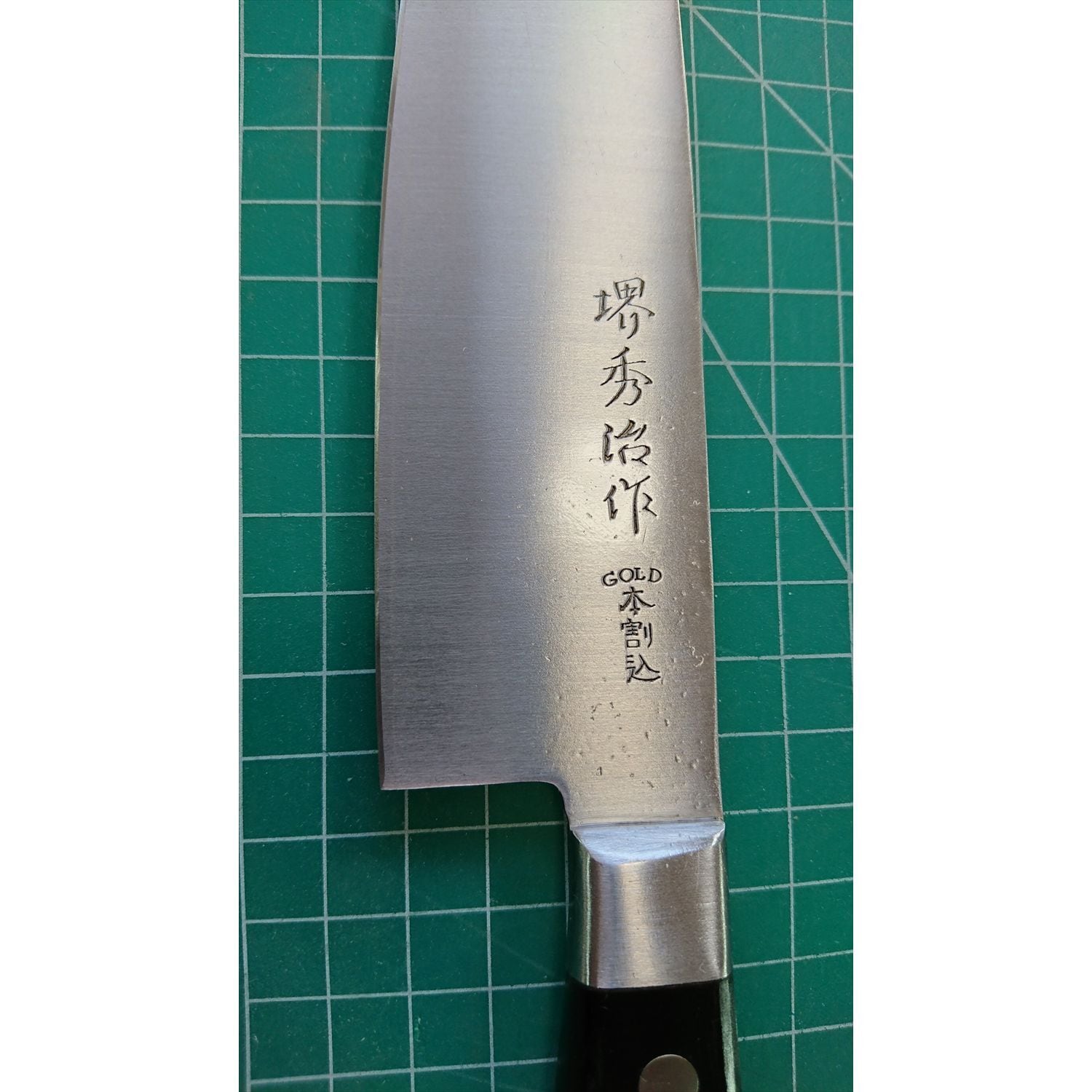 1. o3095/状態:中古/銘:堺秀治/三徳包丁(両刃 左5:右5 右利き・左利き兼用)/刃長:160/峰厚 アゴ上:1.7/重量:128/作り:GOLD本割込(鋼をステンレスでサンド)/他: