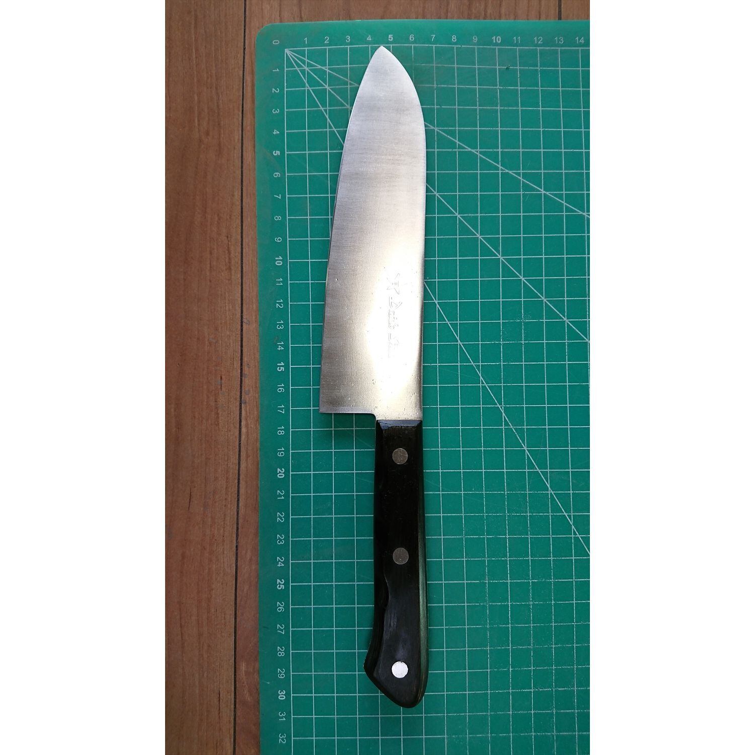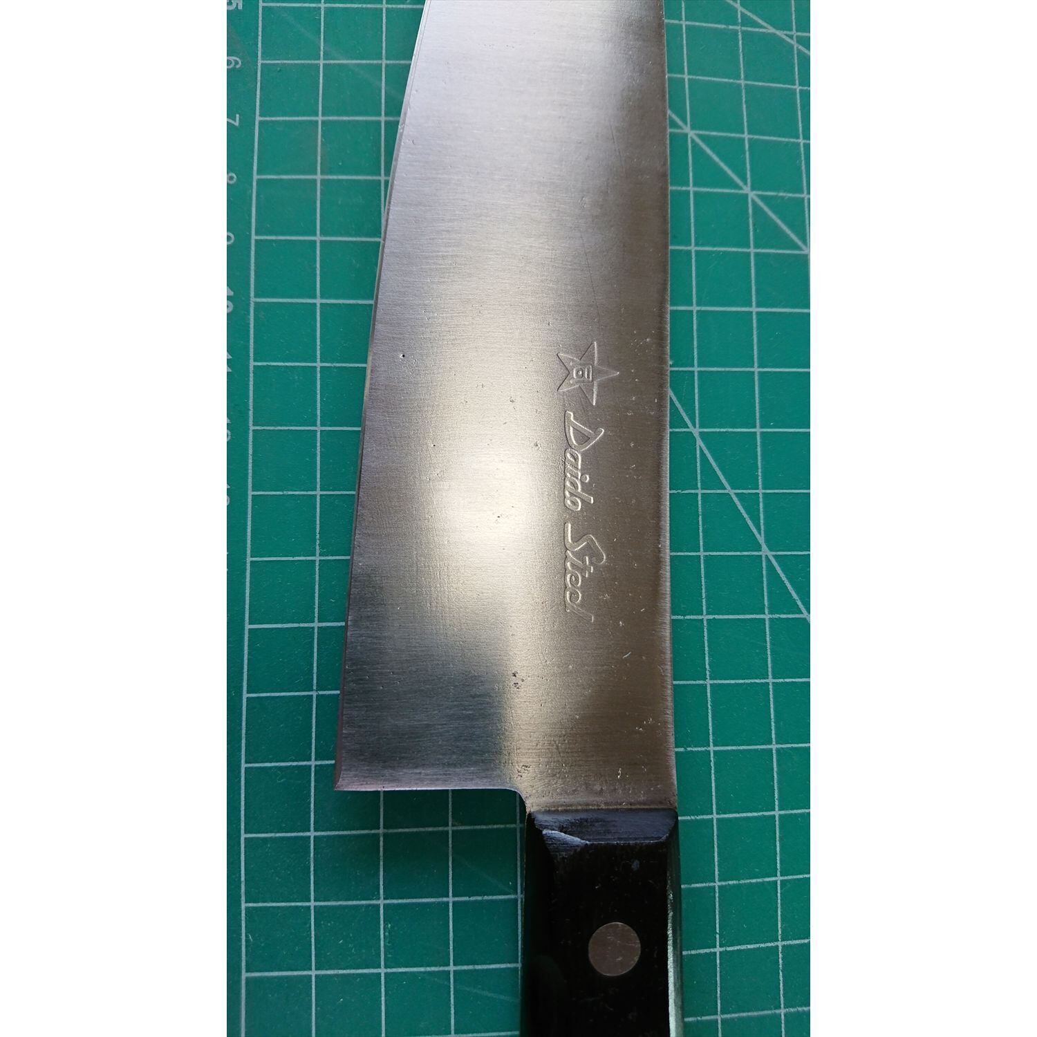 1. o3032/状態:中古/銘:Daido Steel/三徳包丁(両刃 左5:右5 右利き・左利き兼用)/刃長:170/峰厚 アゴ上:2/重量:150/作り:ステンレス系?/他: