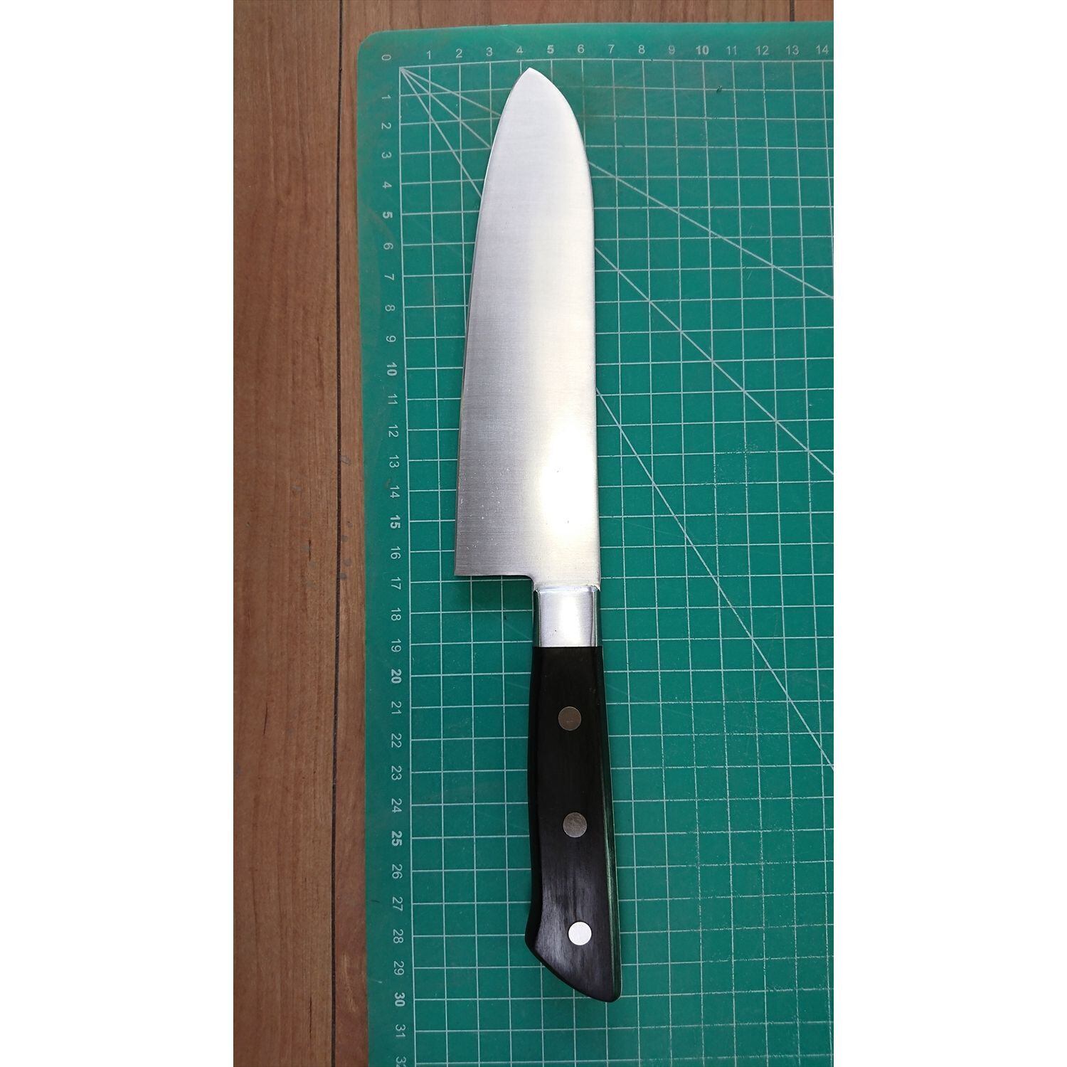 1. o3063/状態:中古/銘:関孫六/三徳包丁(両刃 左5:右5 右利き・左利き兼用)/刃長:165/峰厚 アゴ上:1.9/重量:157/作り:本割込鋼(鋼をステンレスでサンド)/他: