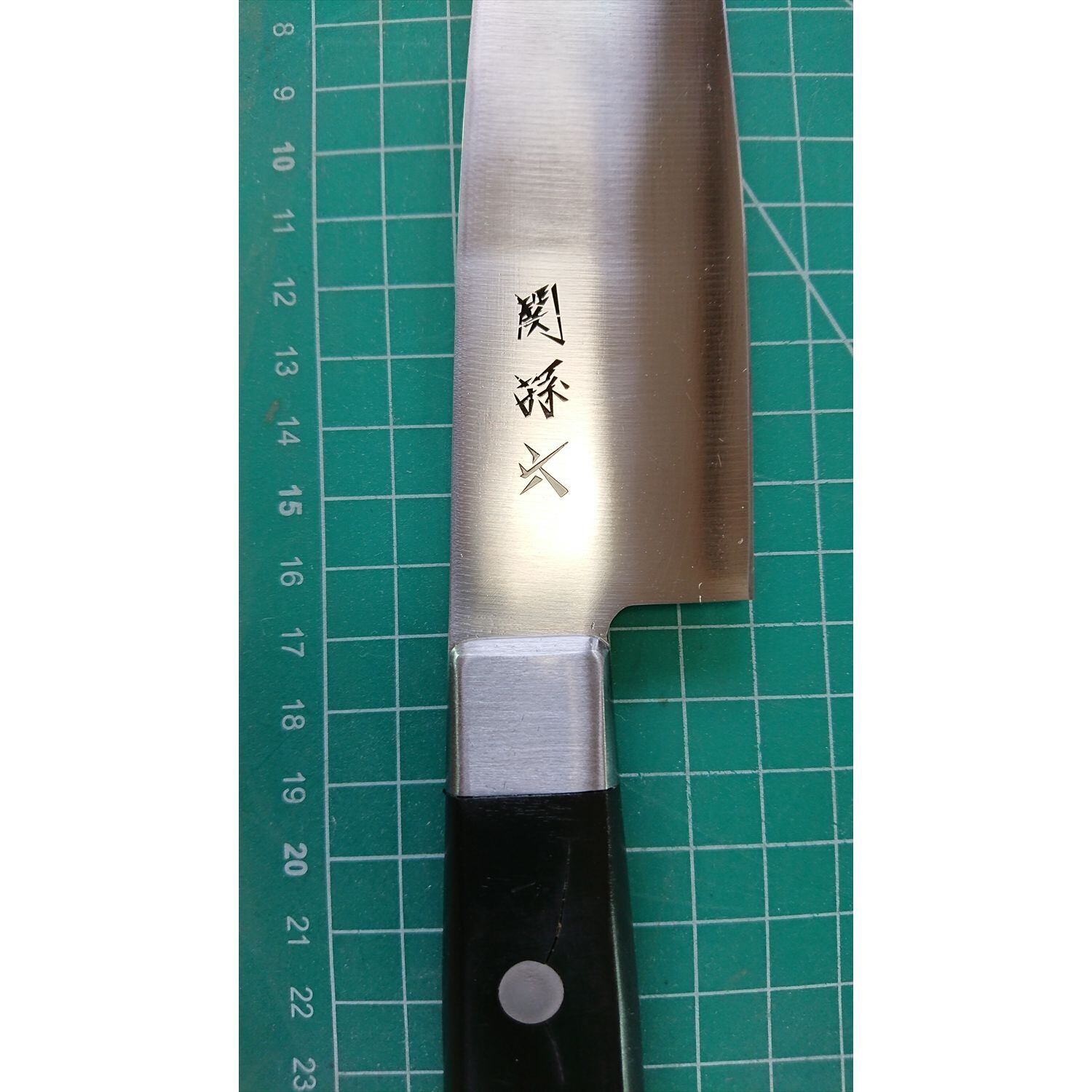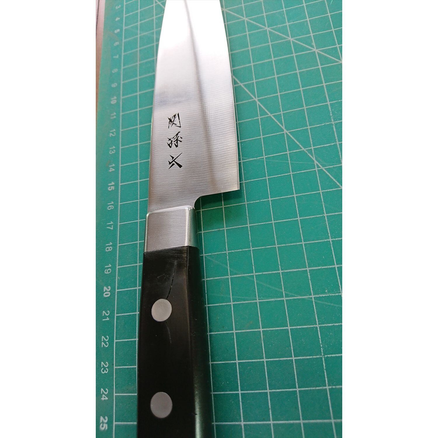 1. o3068/状態:中古/銘:関孫六/三徳包丁(両刃 左5:右5 右利き・左利き兼用)/刃長:165/峰厚 アゴ上:1.8/重量:129/作り:ステンレス/他:柄に一部ヒビ割れあり