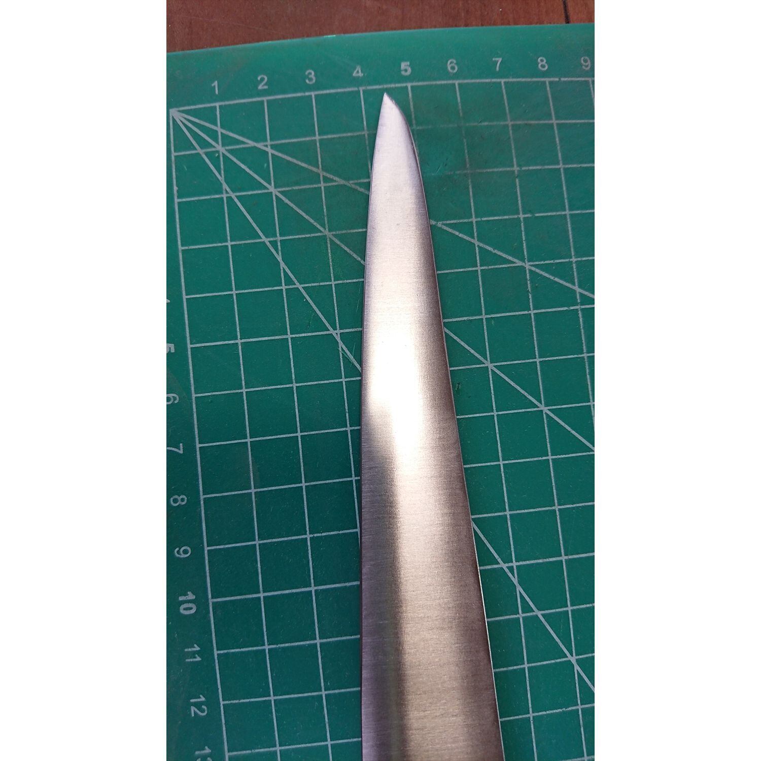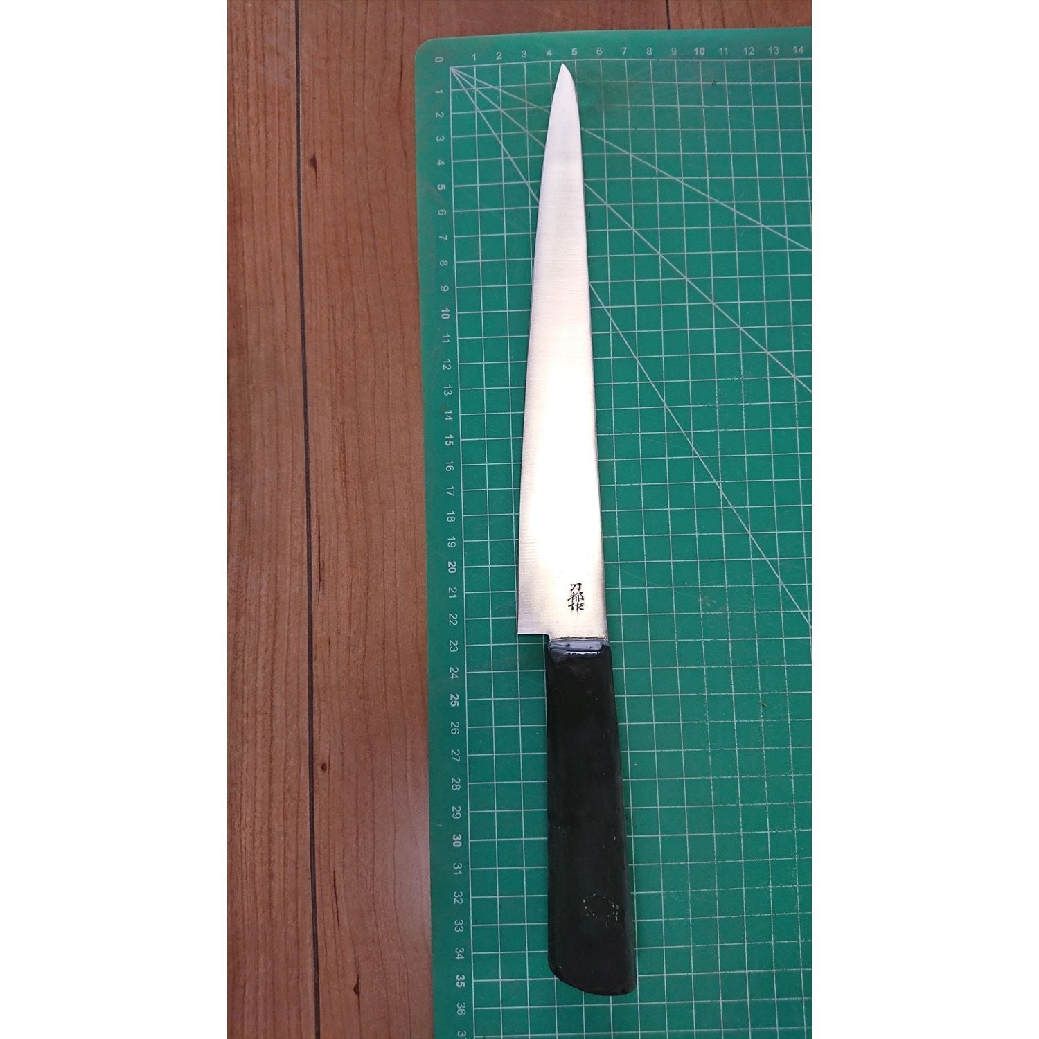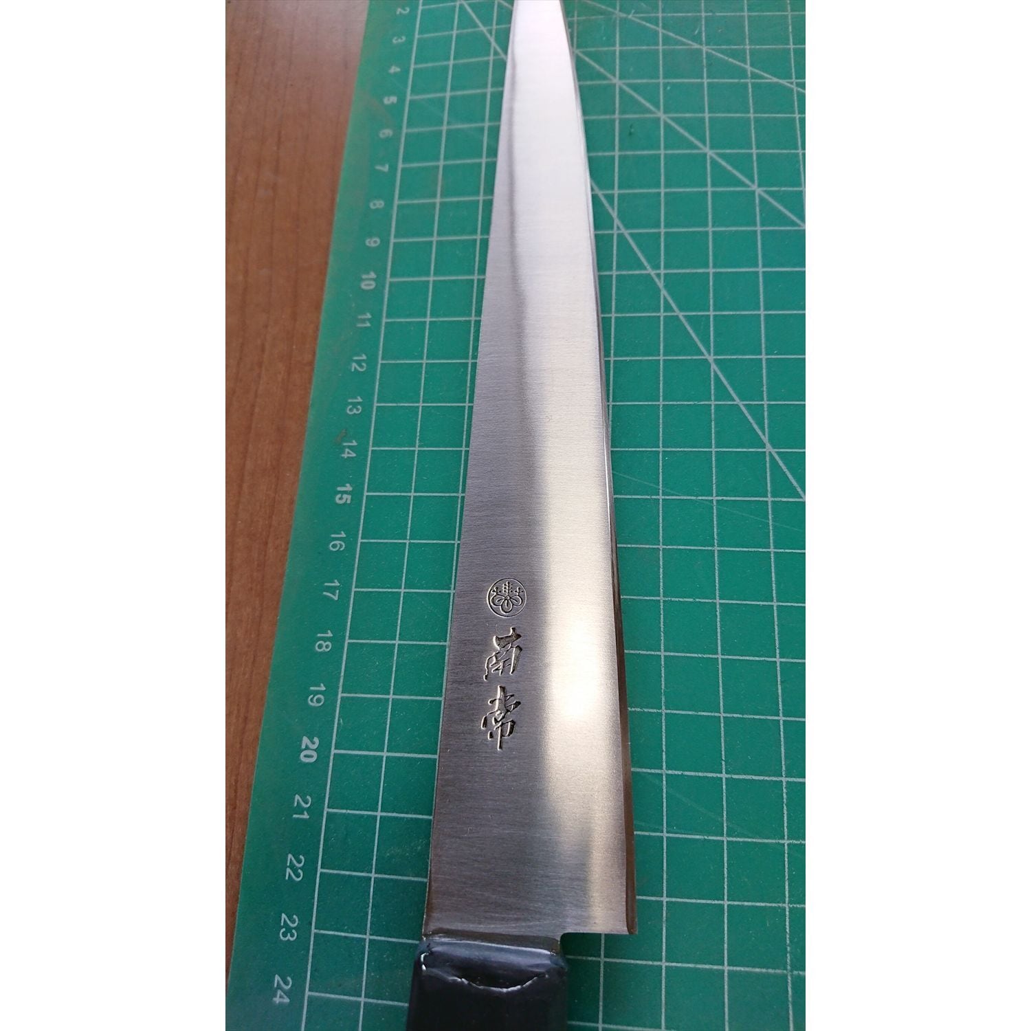 1. o3117/状態:中古/銘:南常/筋引包丁(両刃 約 左1:右9 右利き用)/刃長:225/峰厚 アゴ上:2.2/重量:134/作り:刀都作 ステンレス系 柄はゴム質/他: