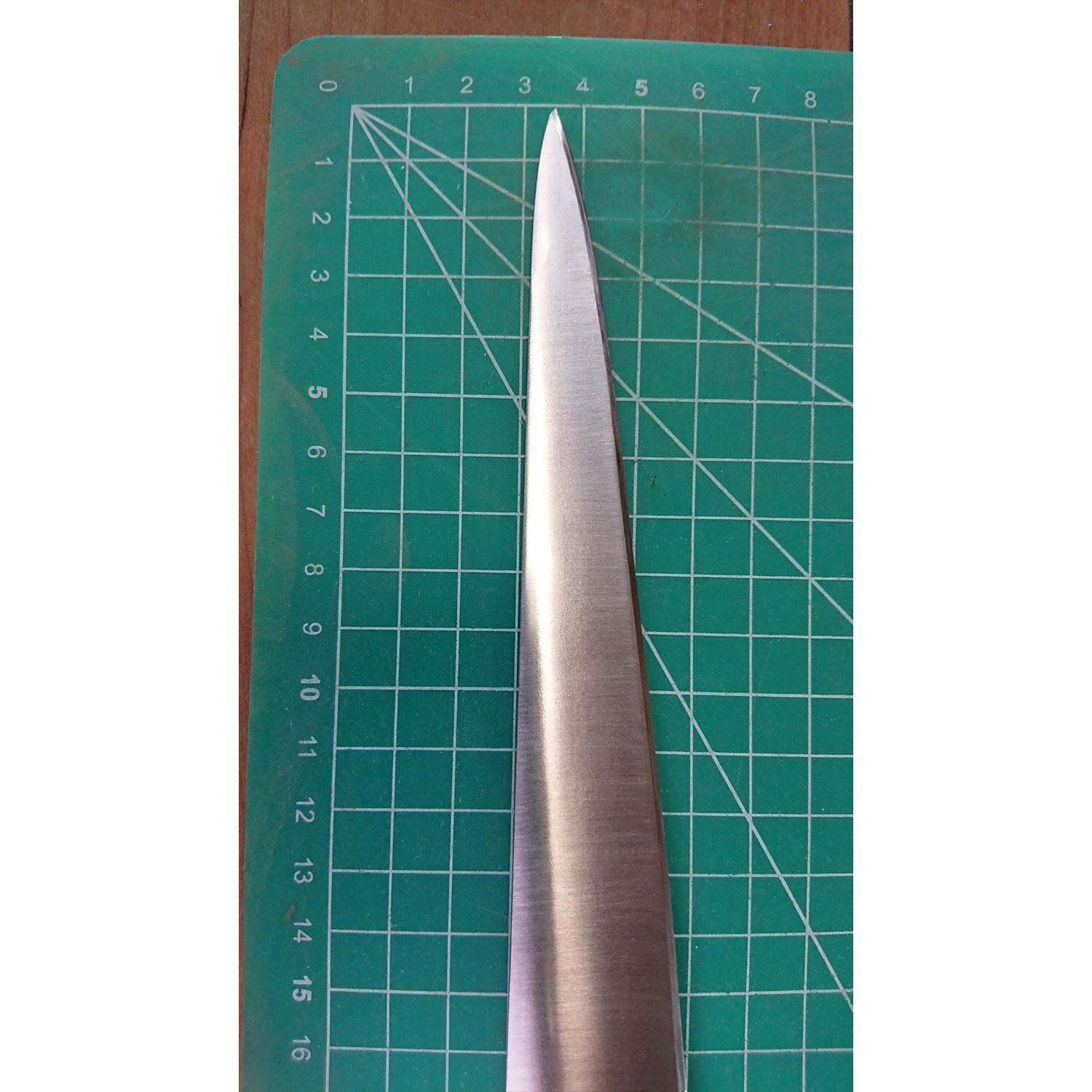 1. o3118/状態:中古/銘:南常/筋引包丁(両刃 約 左1:右9 右利き用)/刃長:225/峰厚 アゴ上:2.3/重量:132/作り:刀都作 ステンレス系 柄はゴム質/他: