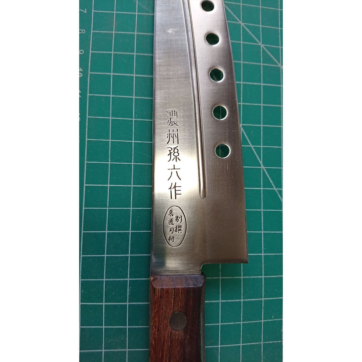 1. o3078/状態:中古/銘:濃州孫六/三徳包丁(両刃 左5:右5 右利き・左利き兼用)/刃長:180/峰厚 アゴ上:1.6/重量:95/作り:STAINLESS STEEL/他: