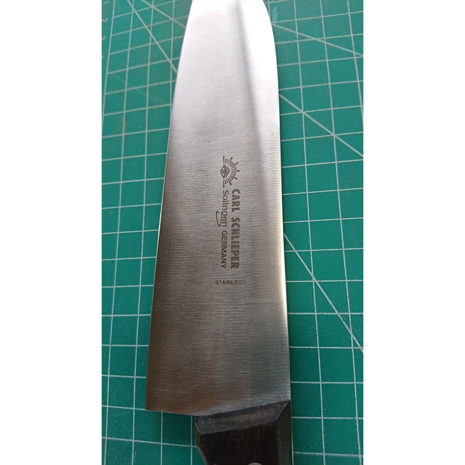 1. o3088/状態:中古/銘:CARL SCHLIEPER/三徳包丁(両刃 左5:右5 右利き・左利き兼用)/刃長:175/峰厚 アゴ上:1.9/重量:114/作り:STAINLESS/他: