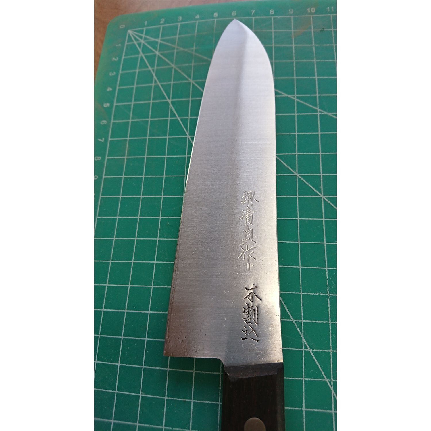 1. o3100/状態:中古/銘:堺清貞/三徳包丁(両刃 左5:右5 右利き・左利き兼用)/刃長:165/峰厚 アゴ上:1.5/重量:92/作り:本割込鋼(鋼をステンレスでサンド)/他: