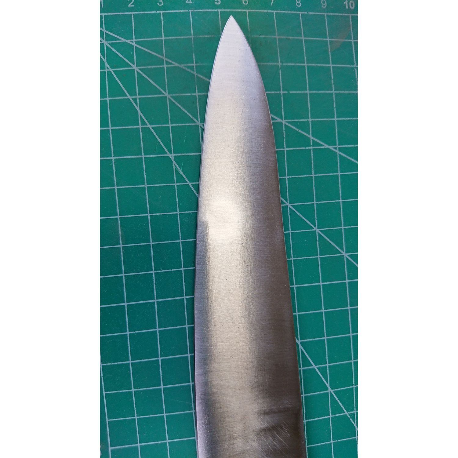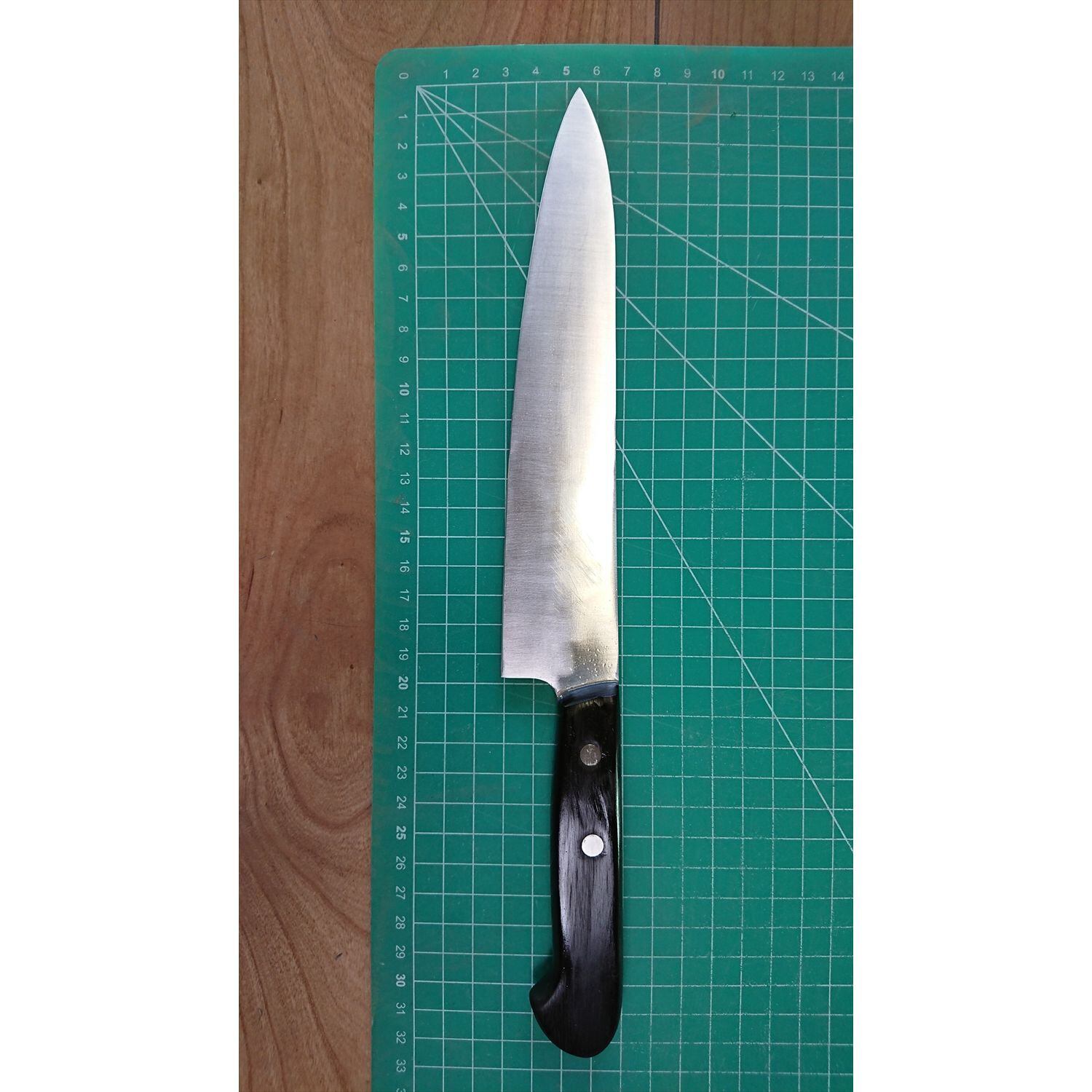 1. o3102/状態:中古/銘:日本橋木屋/牛刀(両刃 左5:右5 右利き・左利き兼用)/刃長:195/峰厚 アゴ上:1.3/重量:98/作り:STAINLESS/他:銘は消失