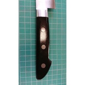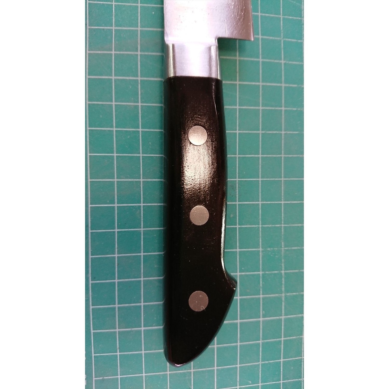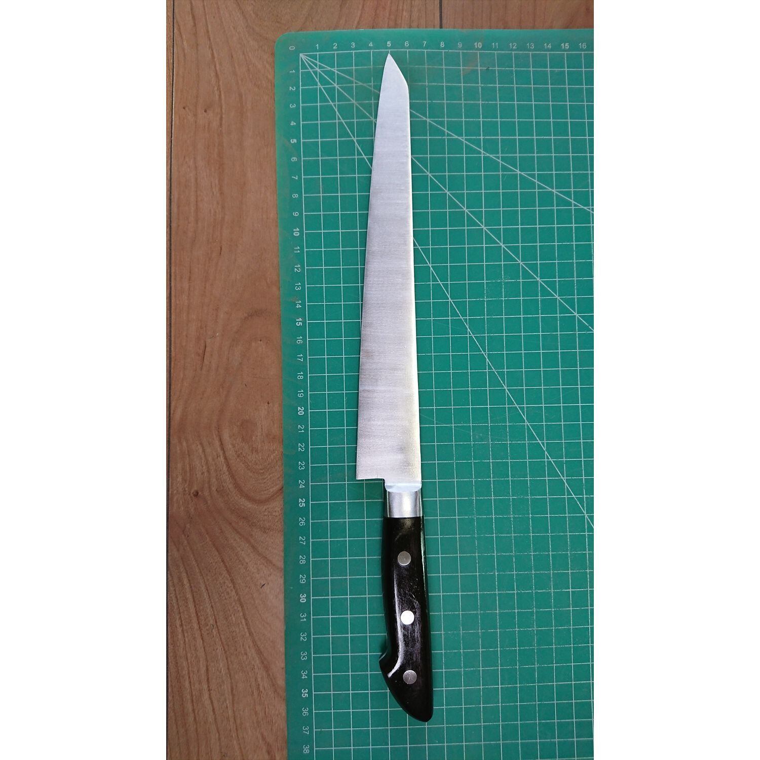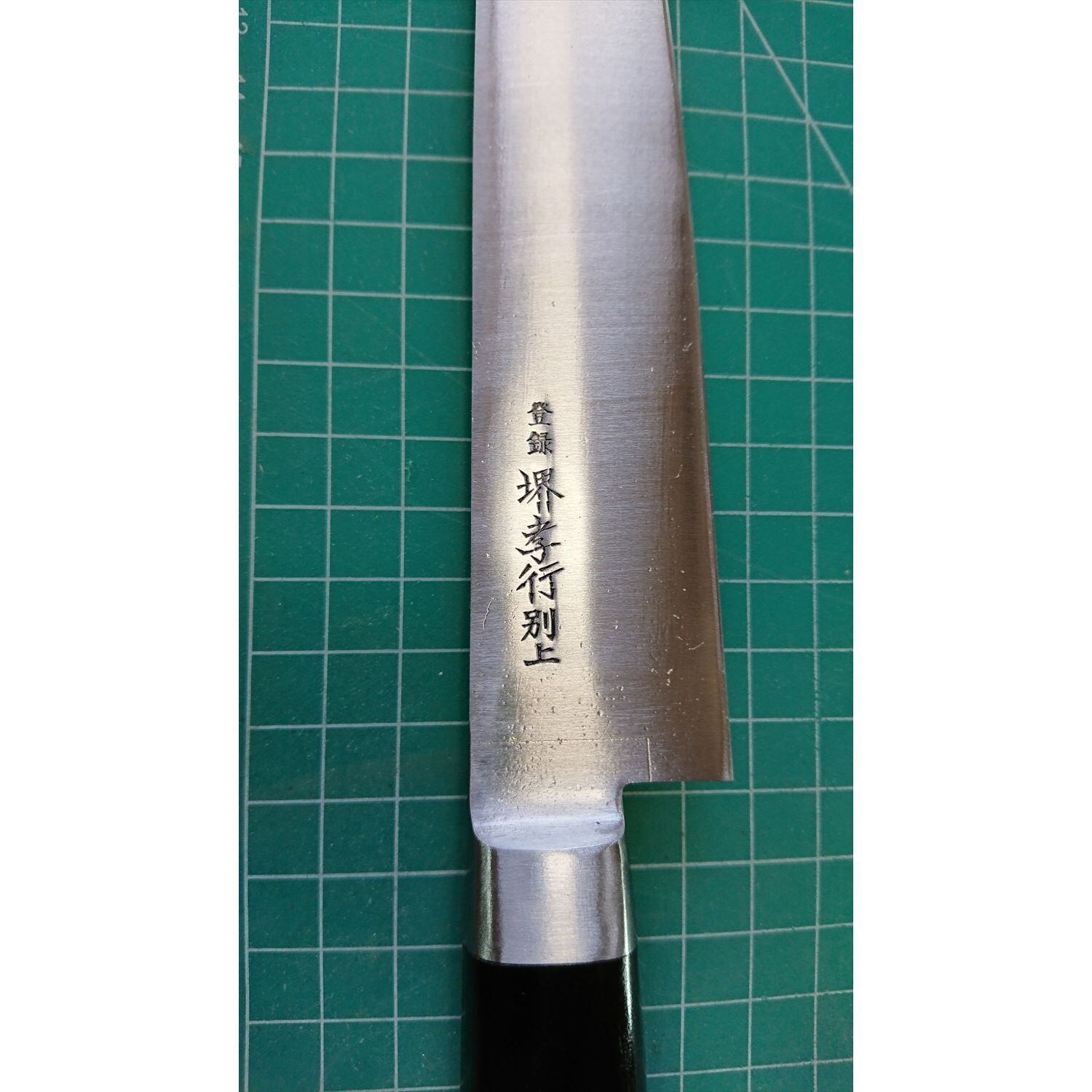 1. o3122/状態:中古/銘:堺孝行 別上/筋引包丁(両刃 約 左1:右9 右利き用)/刃長:235/峰厚 アゴ上:2.0/重量:164/作り:鋼/他:ツバの根元から柄全体にかけて樹脂コーティング済み(防サビの為)