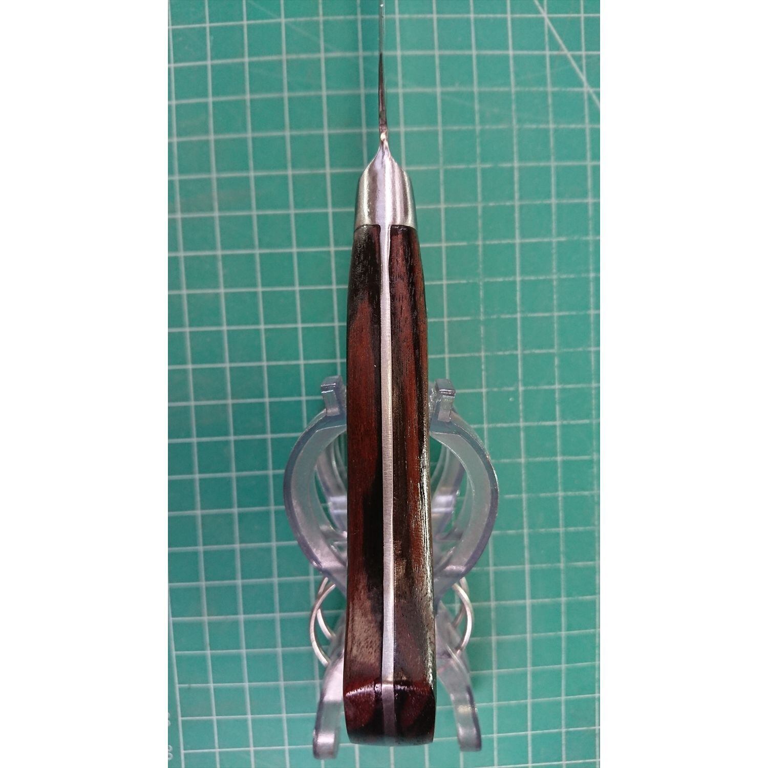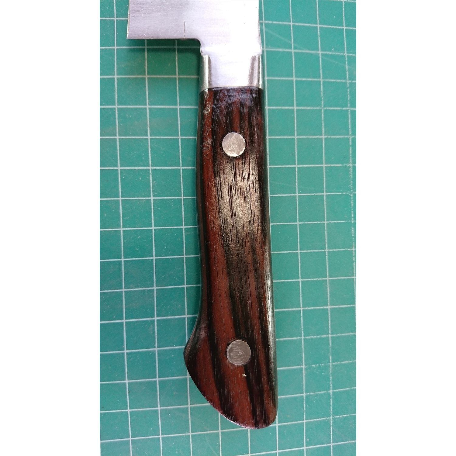 1. o3134/状態:中古/銘:竹峰/牛刀(両刃 左5:右5 右利き・左利き兼用)/刃長:210/峰厚 アゴ上:1.8/重量:143/作り:鋼/他:柄はオーバーホール済み(リベットは新品交換済み)。ツバの根元から柄全体にかけて樹脂コーティング済み(防サビの為)