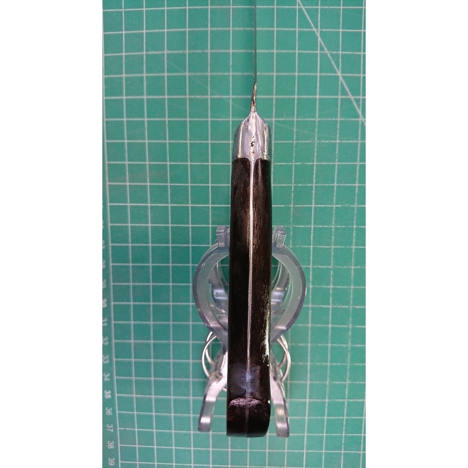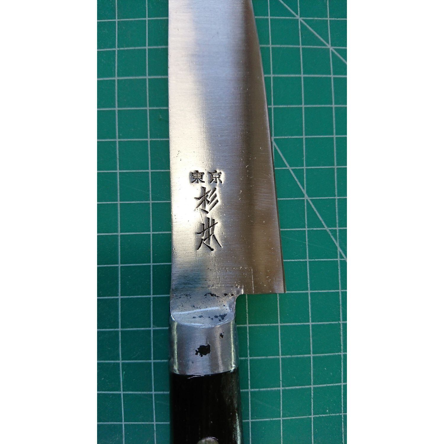 1. o3130/状態:中古/銘:東京杉本/牛刀(両刃 左5:右5 右利き・左利き兼用)/刃長:170/峰厚 アゴ上:1.5/重量:104/作り:鋼/他:柄はオーバーホール済み(リベットは新品交換済み)。ツバの根元から柄全体にかけて樹脂コーティング済み(防サビの為)