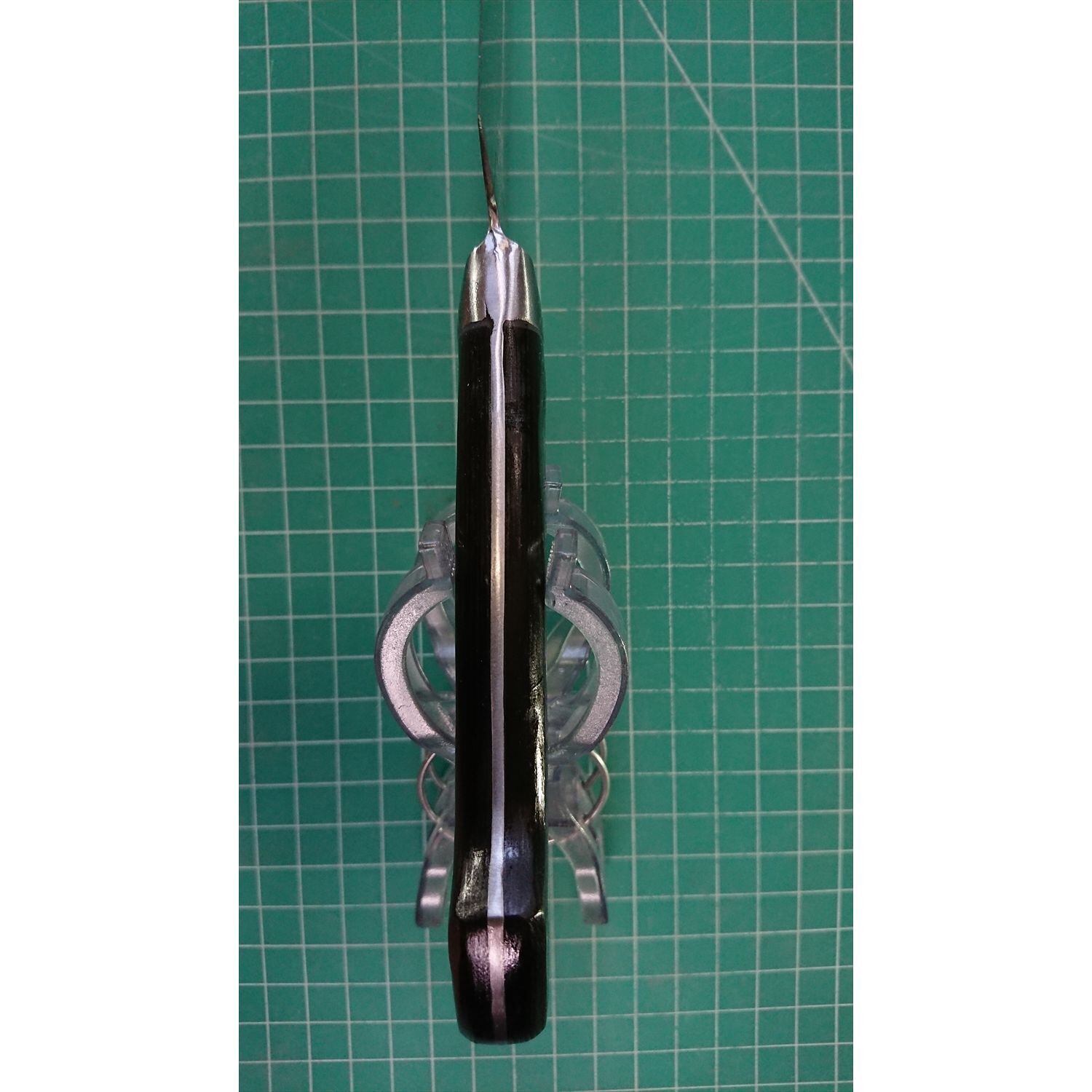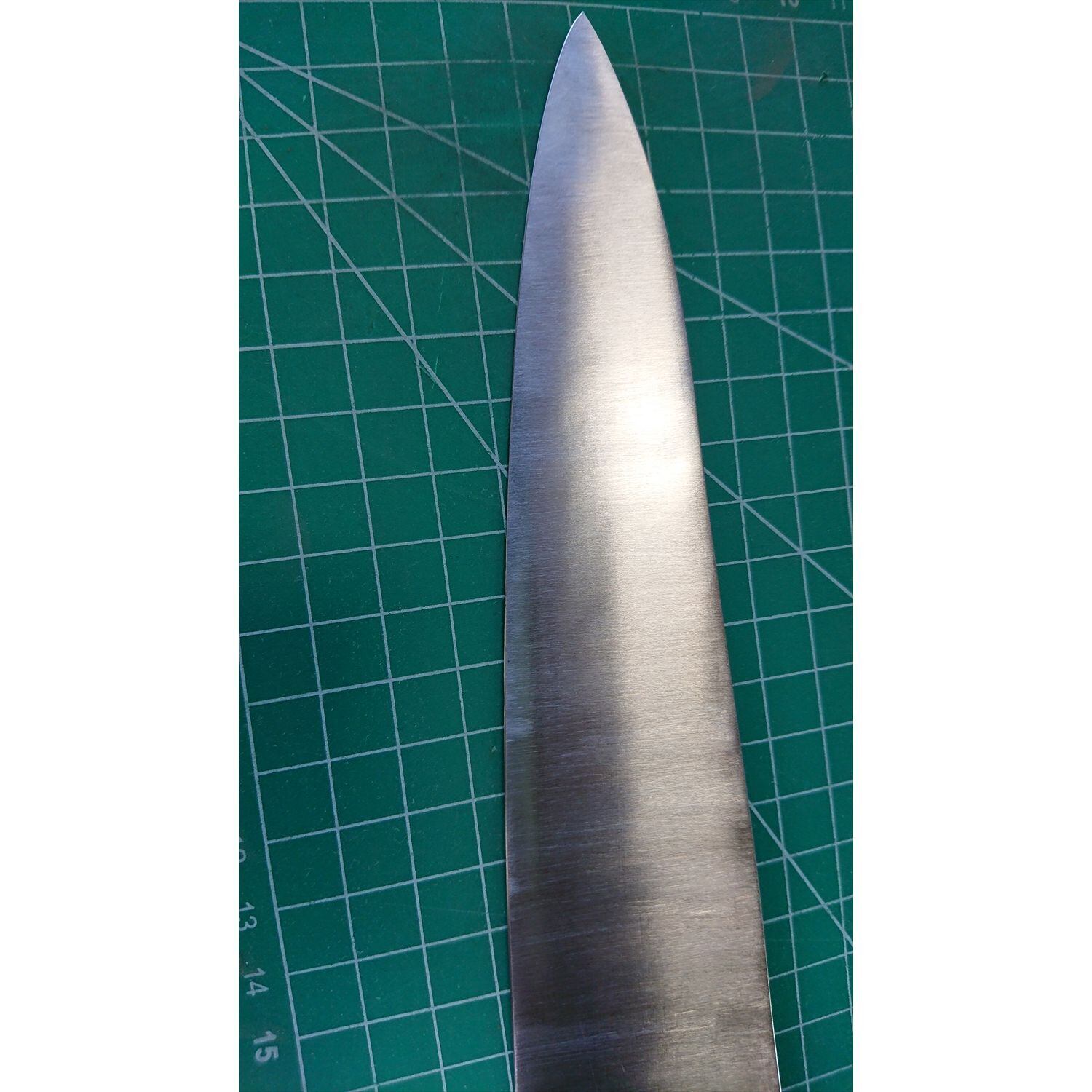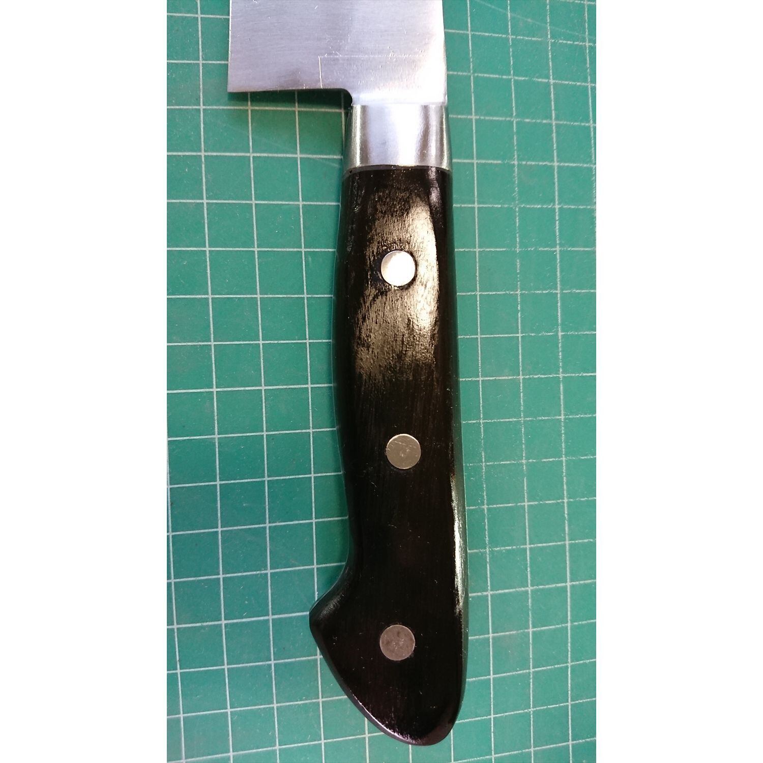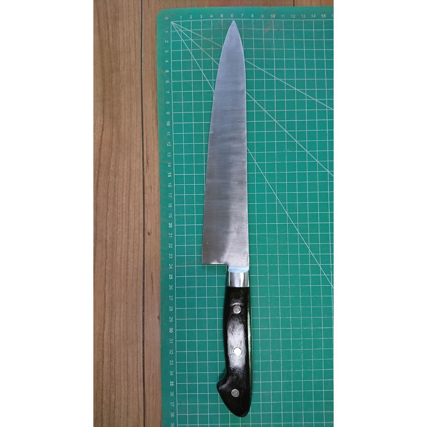 1. o3131/状態:中古/銘:東京杉本/牛刀(両刃 約 左1:右9 右利き用)/刃長:235/峰厚 アゴ上:2.1/重量:170/作り:鋼/他:柄はオーバーホール済み(リベットは新品交換済み)。ツバの根元から柄全体にかけて樹脂コーティング済み(防サビの為)