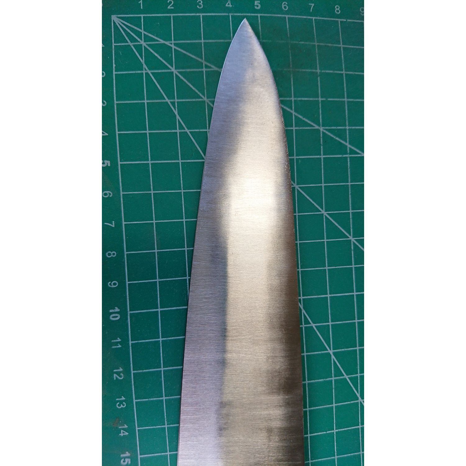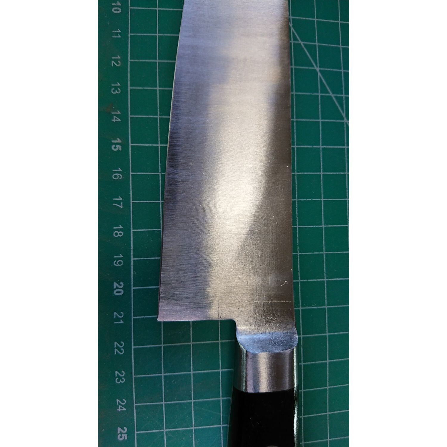 1. o3152/状態:中古/銘:直澄/牛刀(両刃 左5:右5 右利き・左利き兼用)/刃長:210/峰厚 アゴ上:1.5/重量:158/作り:鋼/他:ツバの根元から柄全体にかけて樹脂コーティング済み(防サビの為)