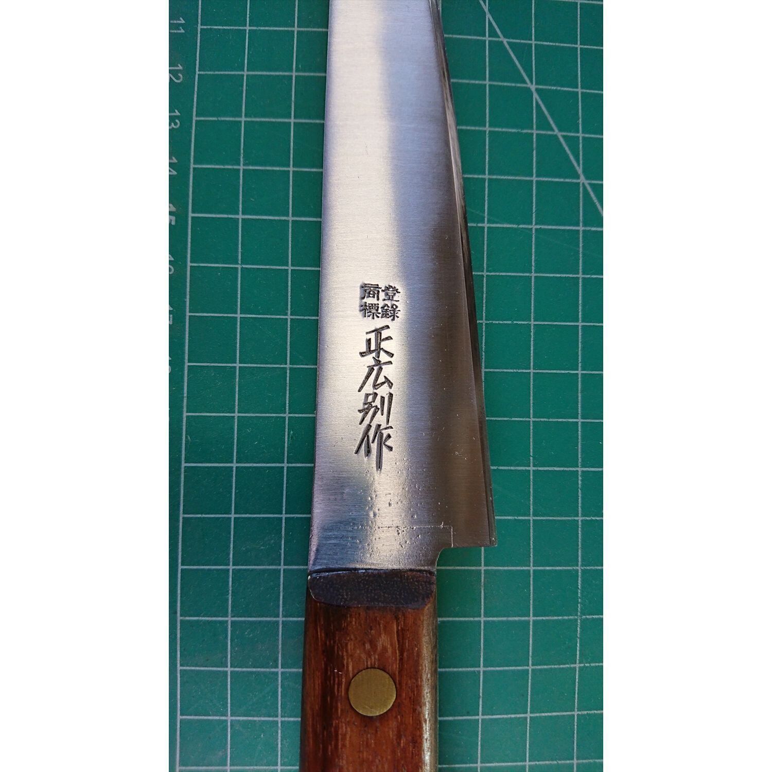 1. o3156/状態:中古/銘:正広別作/筋引包丁(両刃 約 左1:右9 右利き用)/刃長:215/峰厚 アゴ上:2.2/重量:148/作り:鋼/他:ツバの根元から柄全体にかけて樹脂コーティング済み(防サビの為)