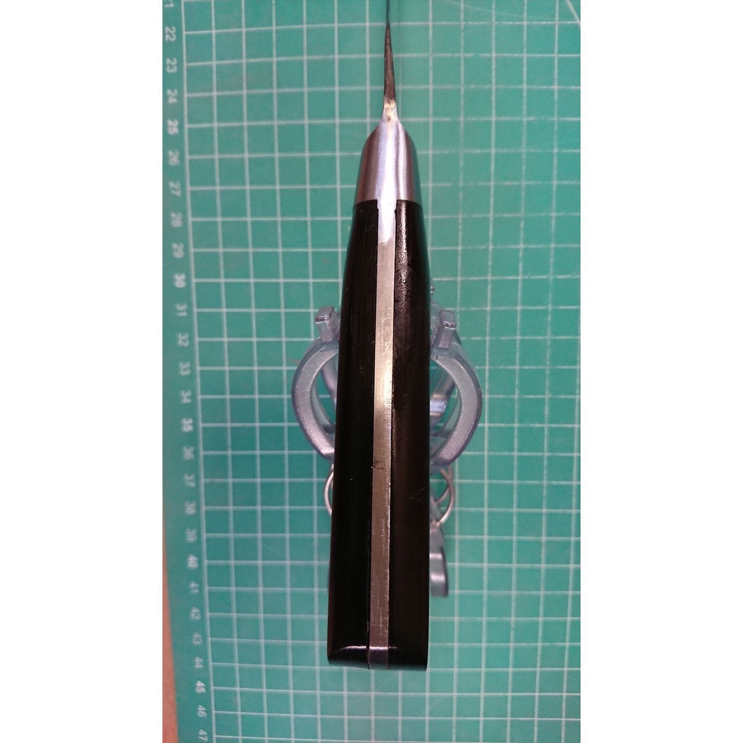 1. o3123/状態:中古/銘:HIDARI TOGIKUNI/洋出刃包丁(両刃 左5:右5 右利き・左利き兼用)/刃長:240/峰厚 アゴ上:3.8/重量:340/作り:CARBON STEEL/他:ツバの根元から柄全体にかけて樹脂コーティング済み(防サビの為)