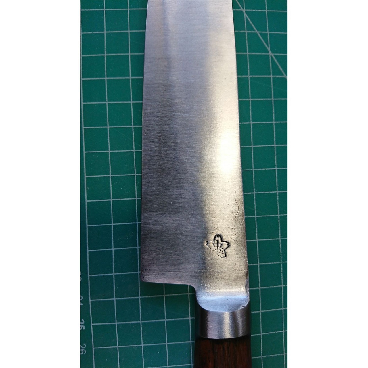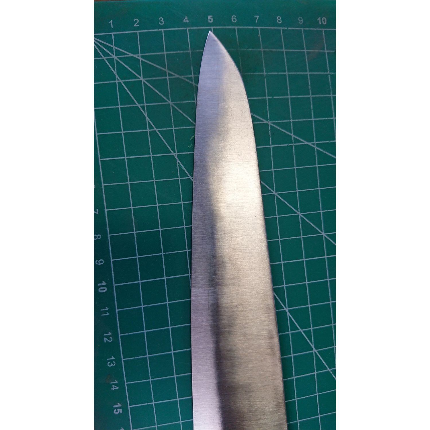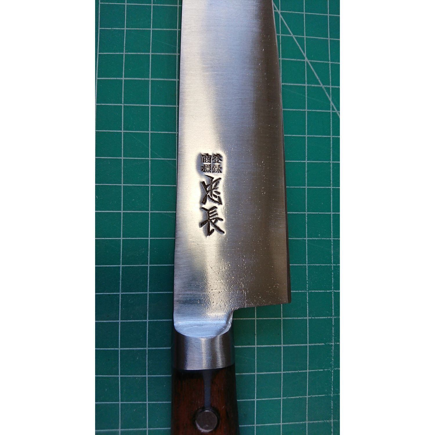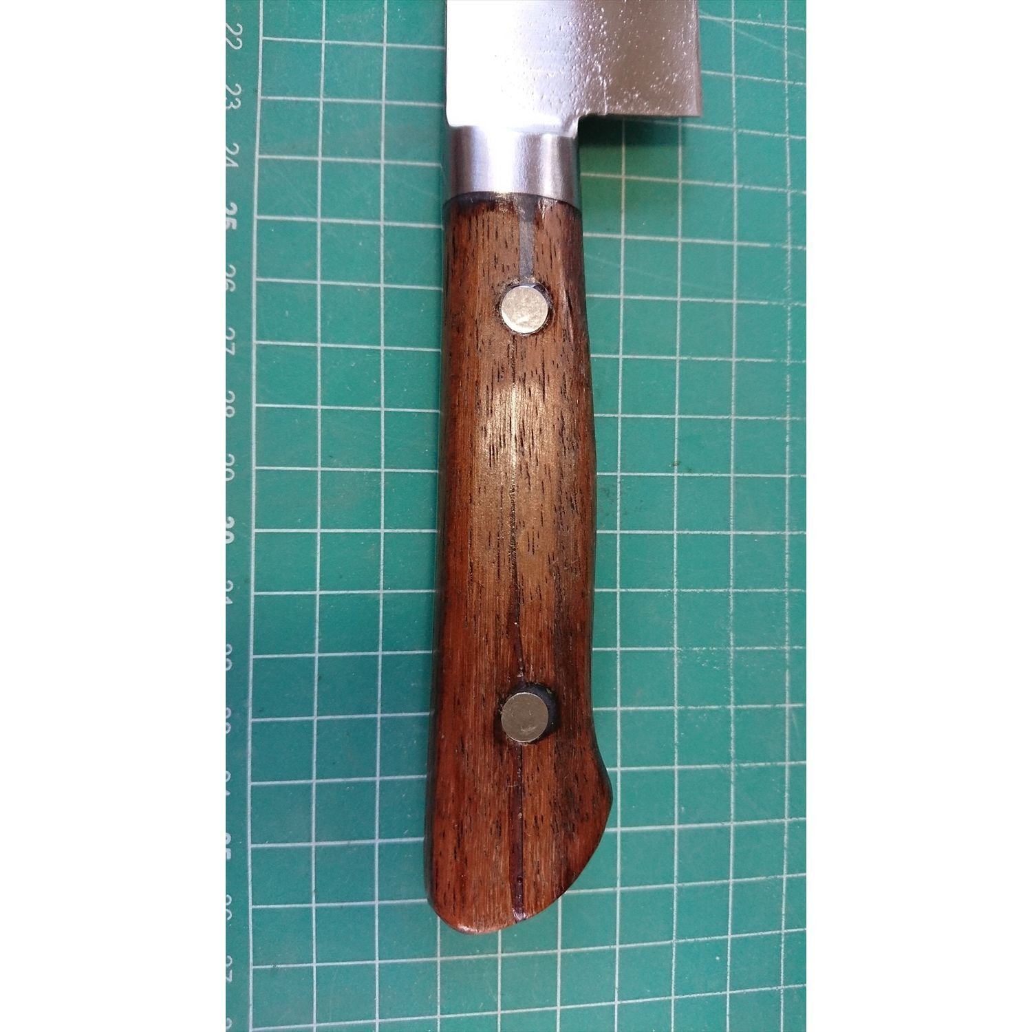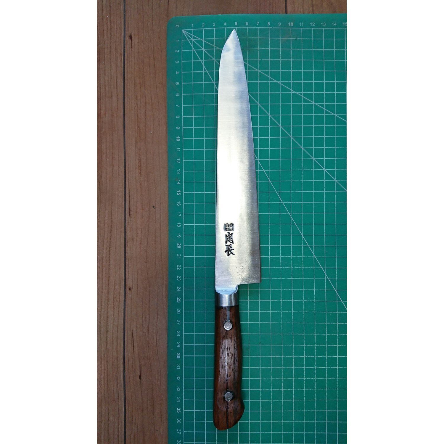 1. o3133/状態:中古/銘:忠長/牛刀(両刃 約 左1:右9 右利き用)/刃長:230/峰厚 アゴ上:2.1/重量:169/作り:鋼/他:柄はオーバーホール済み(リベットは新品交換済み)。ツバの根元から柄全体にかけて樹脂コーティング済み(防サビの為)