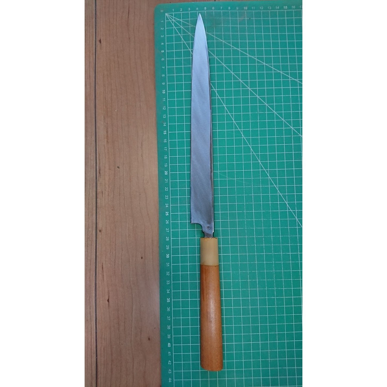 1. o3176/状態:中古/銘:築地正本○秀/刺身包丁(片刃 右利き用)/刃長:280/峰厚 アゴ上:4.8/重量:158/作り:鋼 水牛柄/他:さや付き。ツバの根元から柄全体にかけて樹脂コーティング済み(防サビの為)