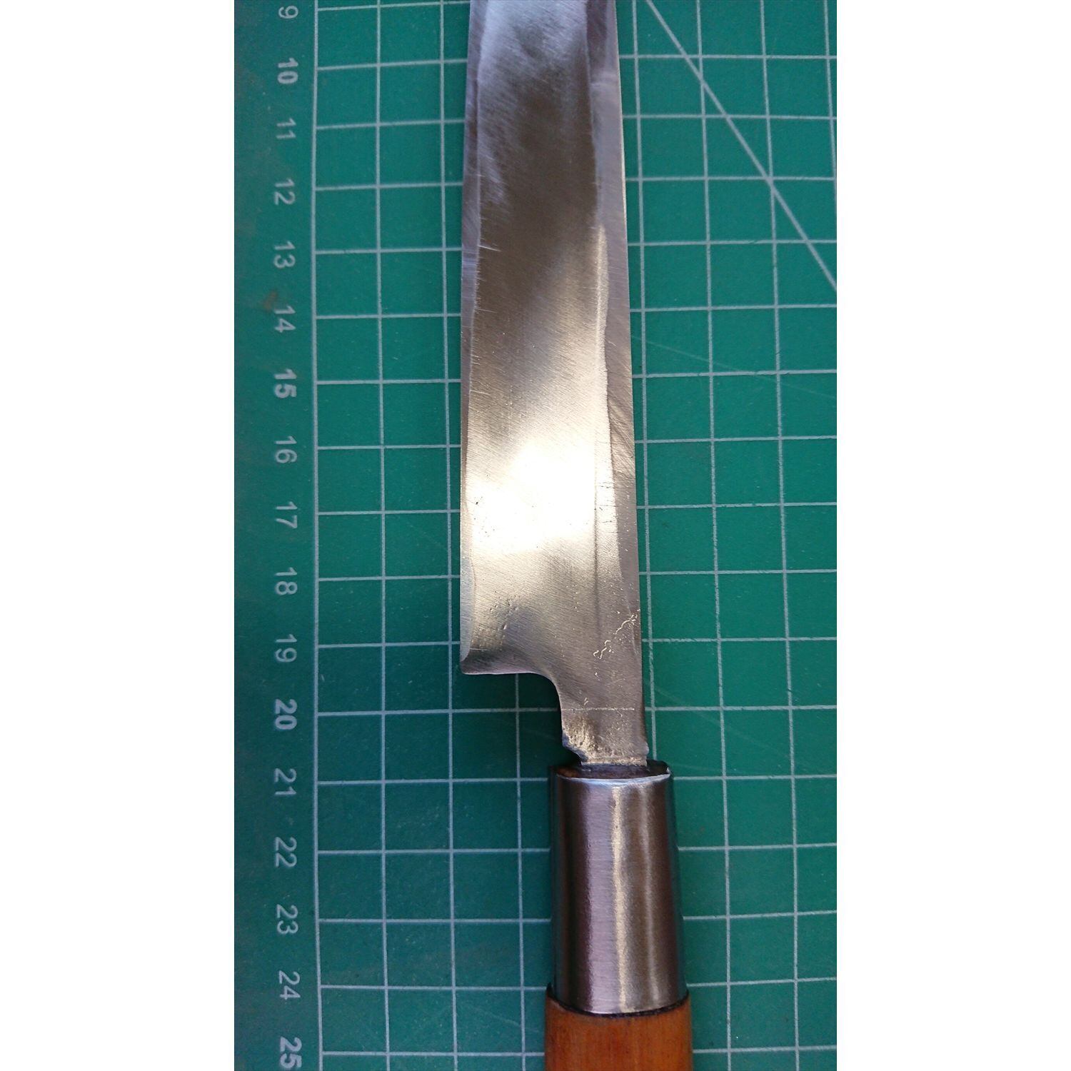 1. o3178/状態:中古/銘:有次/刺身包丁(片刃 右利き用)/刃長:190/峰厚 アゴ上:3.4/重量:101/作り:鋼 特製/他:ツバの根元から柄全体にかけて樹脂コーティング済み(防サビの為)
