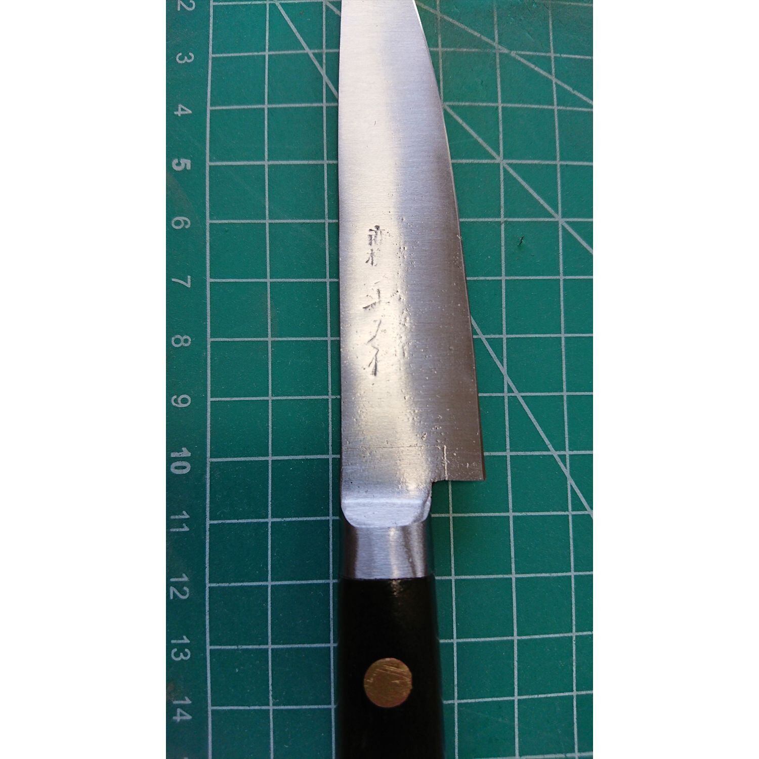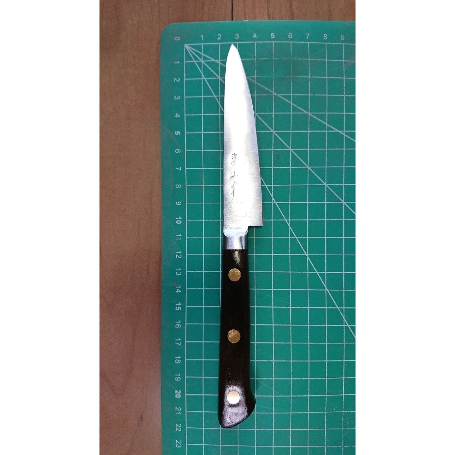 1. o3149/状態:中古/銘:正広/ペティナイフ(両刃 左5:右5 右利き・左利き兼用)/刃長:105/峰厚 アゴ上:1.6/重量:72/作り:鋼/他:銘はほぼ消失。ツバの根元から柄全体にかけて樹脂コーティング済み(防サビの為)