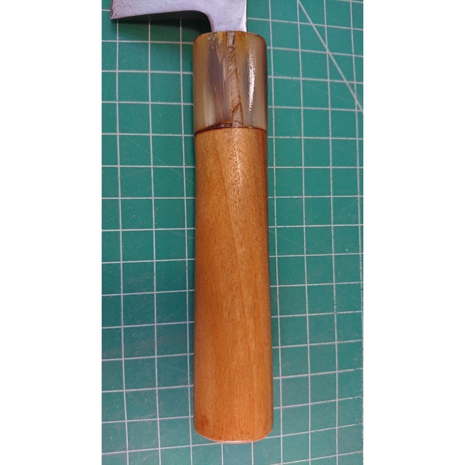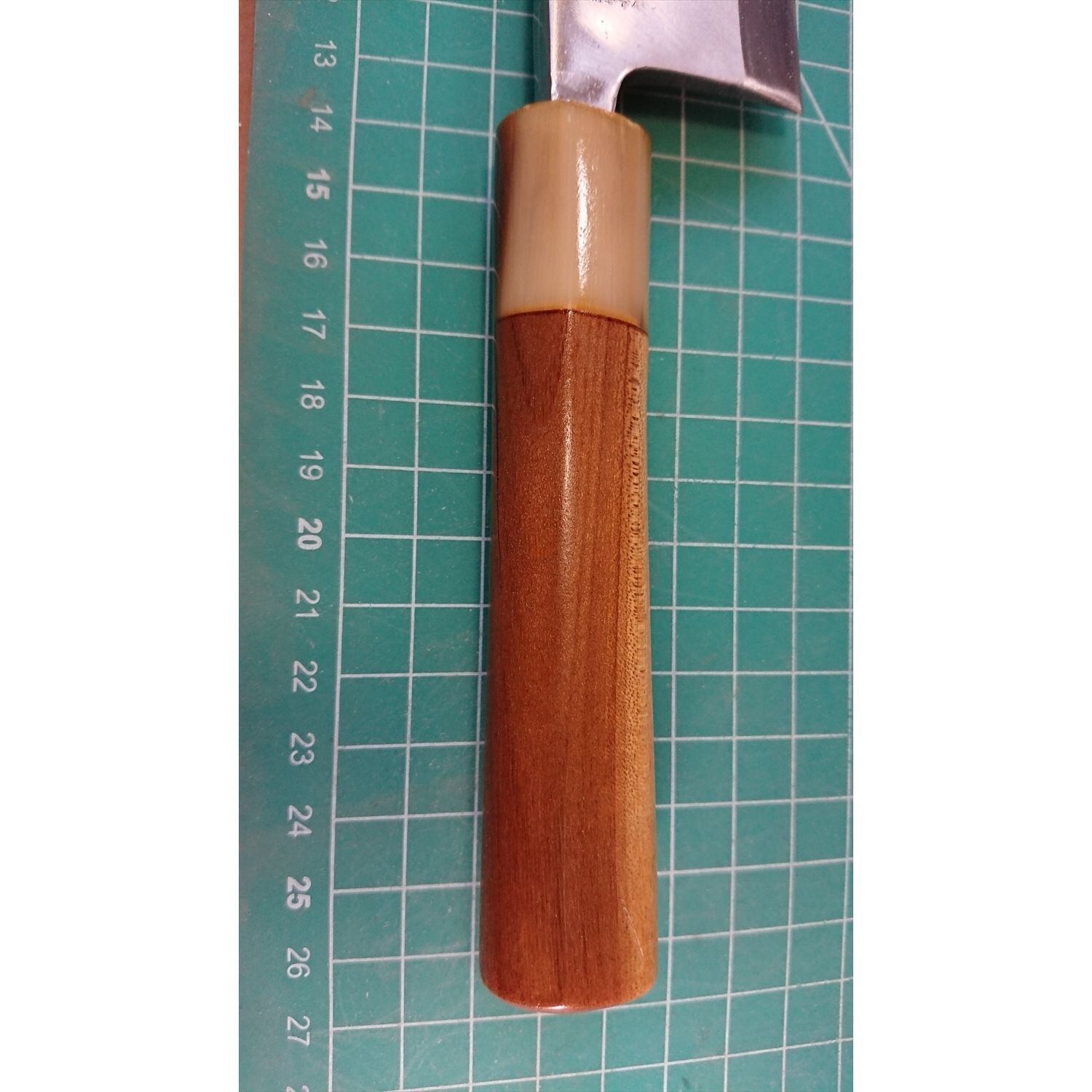 1. o3183/状態:中古/銘:正本総本店/出刃包丁(片刃 右利き用)/刃長:135/峰厚 アゴ上:6.7/重量:175/作り:鋼 水牛柄/他:ツバの根元から柄全体にかけて樹脂コーティング済み(防サビの為)