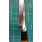 1. o3170/状態:中古/銘:歌貞木屋/刺身包丁(片刃 右利き用)/刃長:160/峰厚 アゴ上:3.4/重量:96/作り:鋼/他:ツバの根元から柄全体にかけて樹脂コーティング済み(防サビの為)
