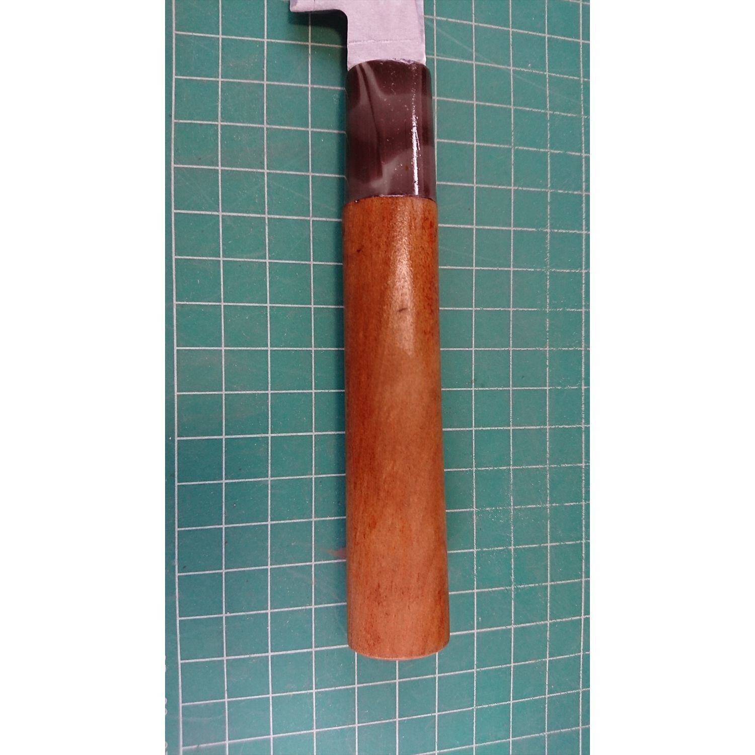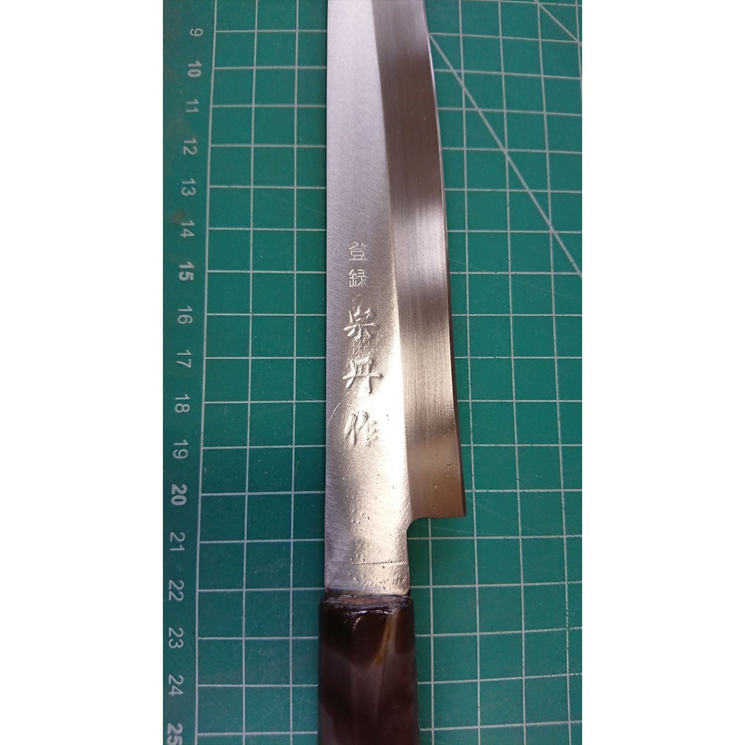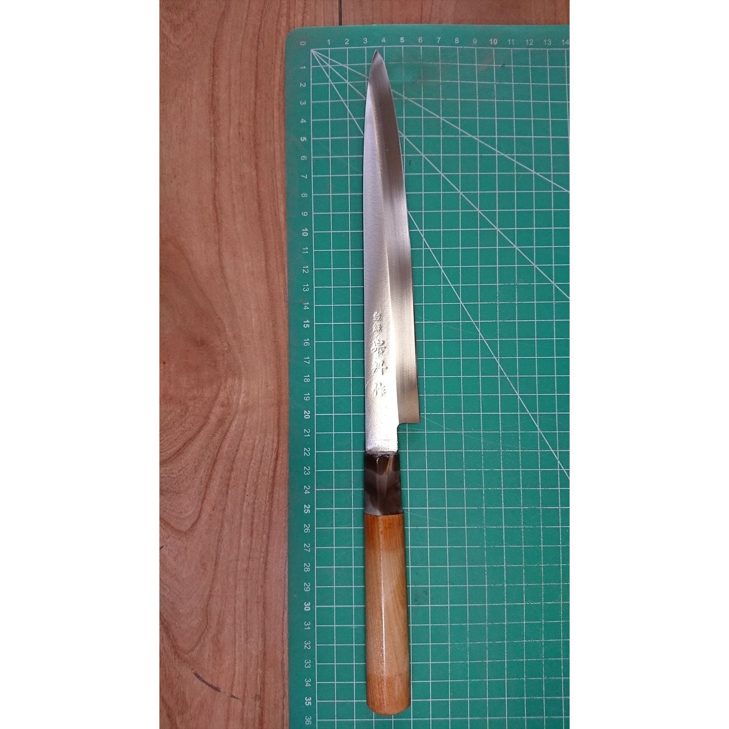 1. o3184/状態:中古/銘:宗丹/刺身包丁(片刃 右利き用)/刃長:205/峰厚 アゴ上:2.9/重量:117/作り:鋼/他:ツバの根元から柄全体にかけて樹脂コーティング済み(防サビの為)