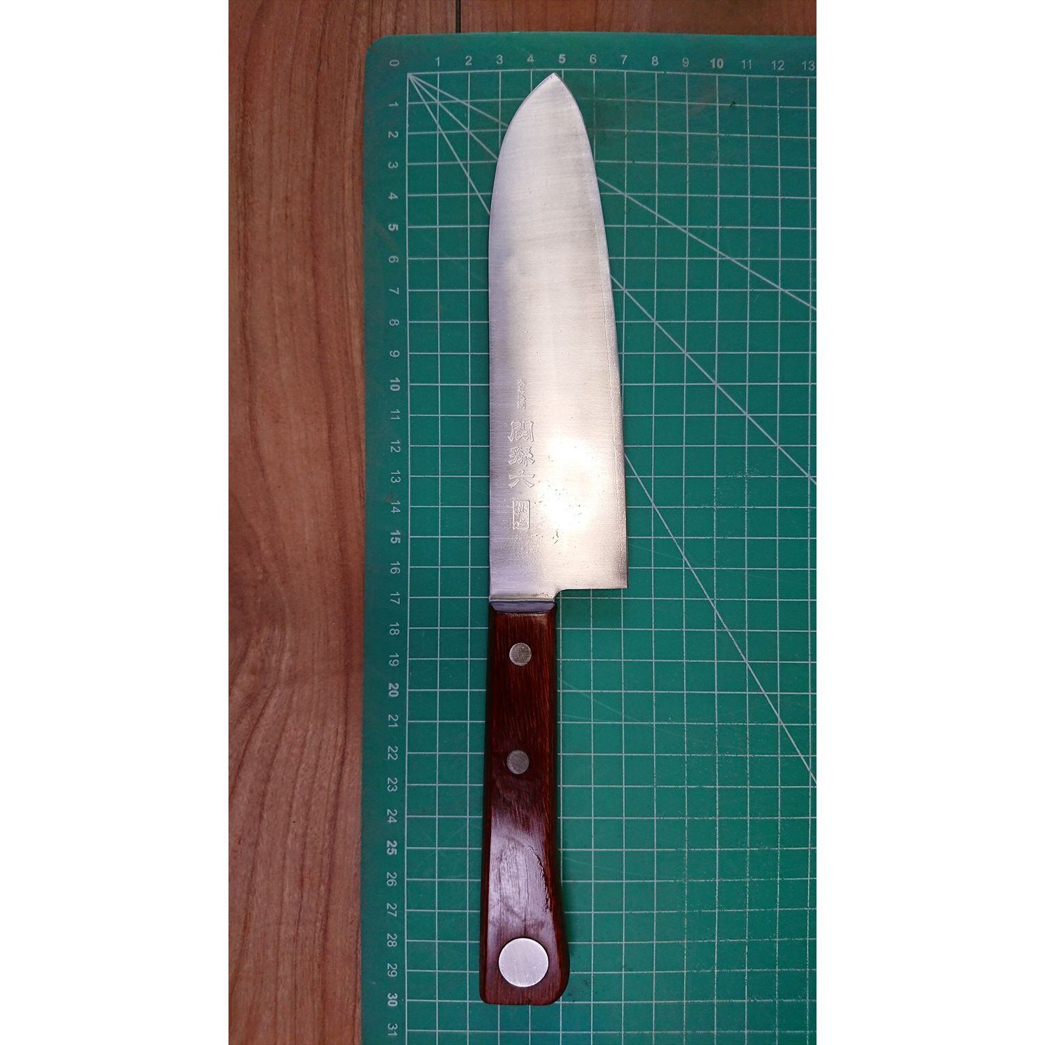1. o3197/状態:中古/銘:関孫六 桃山/三徳包丁(両刃 左5:右5 右利き・左利き兼用)/刃長:165/峰厚 アゴ上:1.6/重量:116/作り:本割込鋼(鋼をステンレスでサンド)/他: