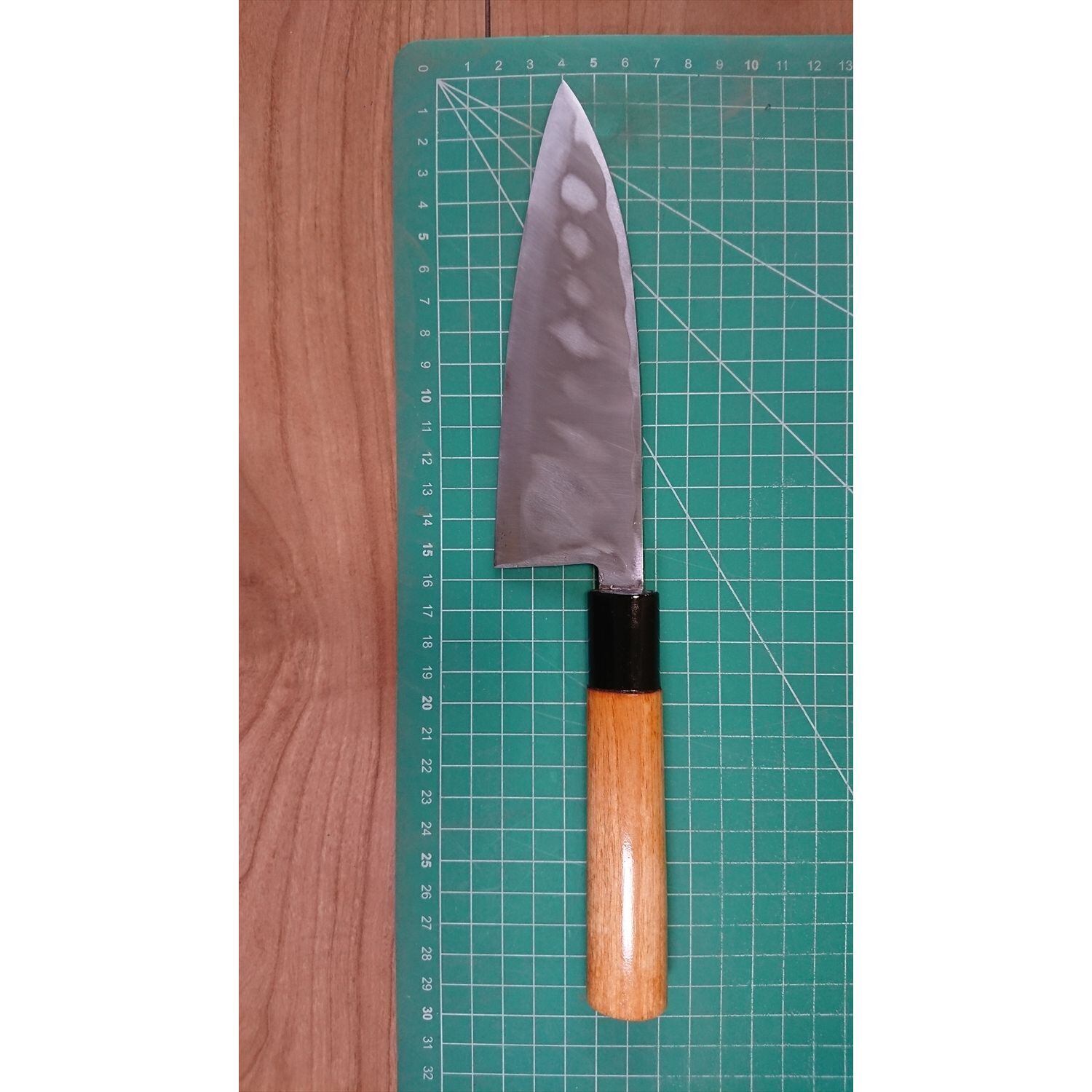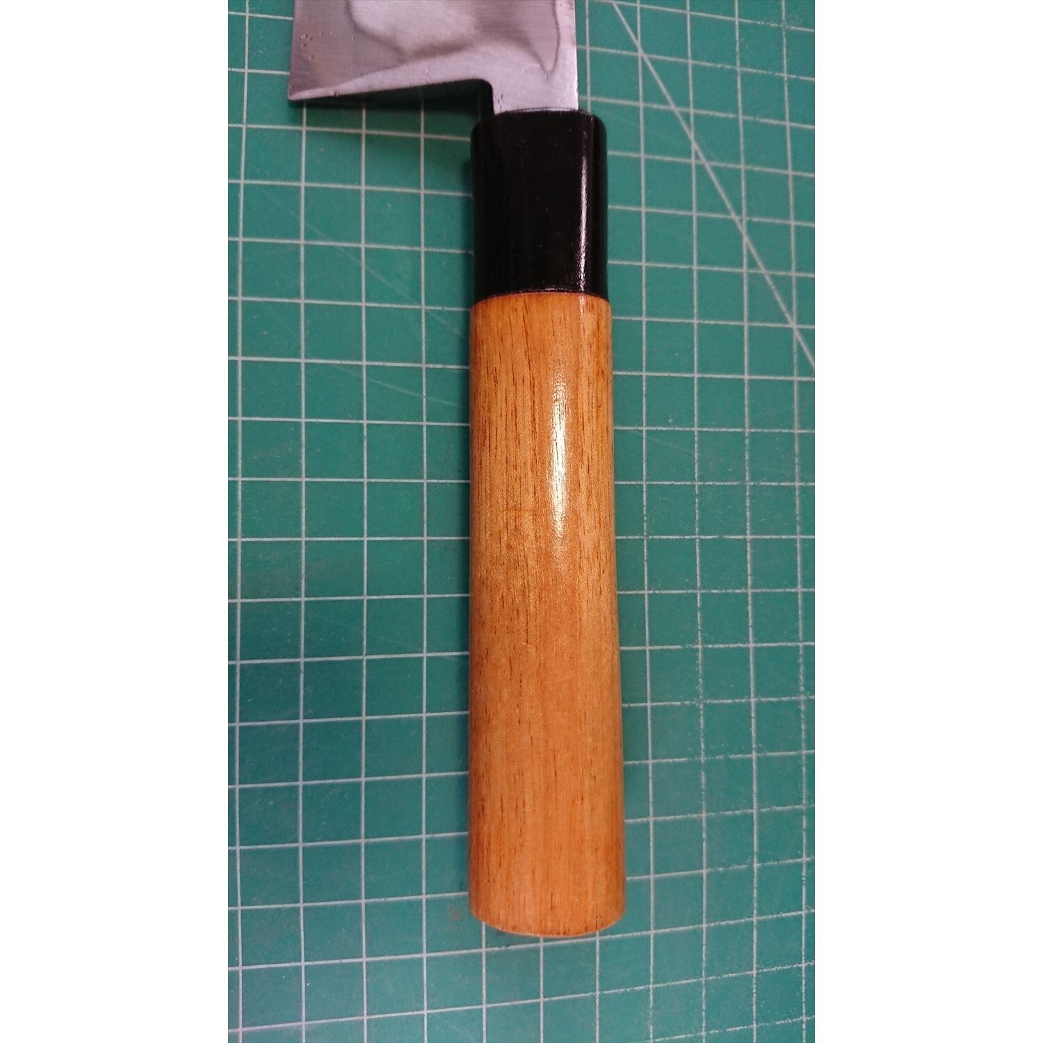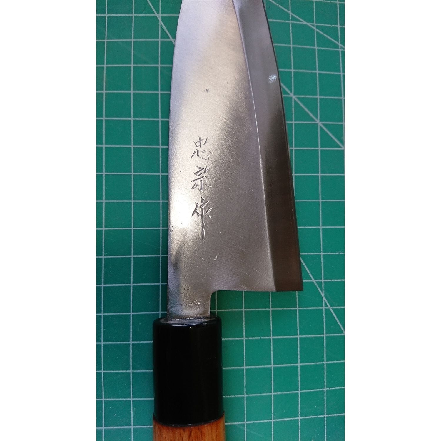 1. o3200/状態:中古/銘:忠宗作/出刃包丁(片刃 右利き用)/刃長:155/峰厚 アゴ上:5.0/重量:230/作り:特殊鋼別作/他:ツバの根元から柄全体にかけて樹脂コーティング済み(防サビの為)