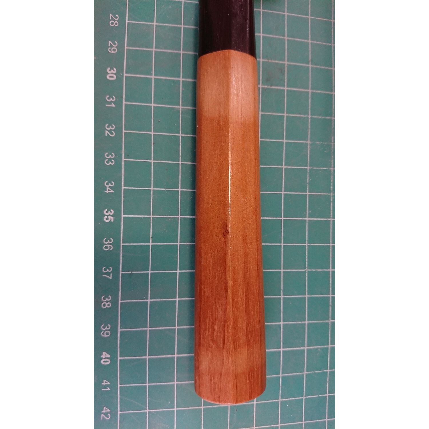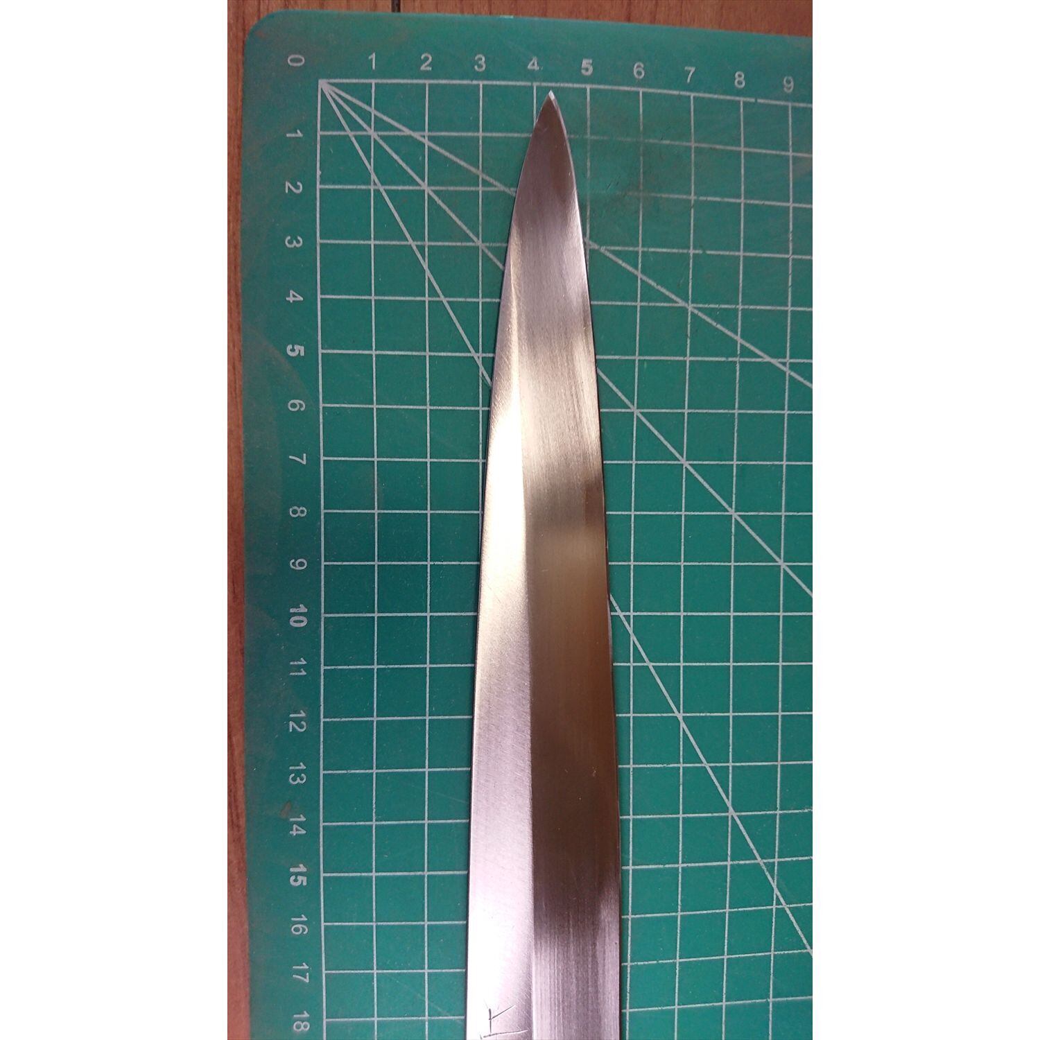 1. o3202/状態:中古/銘:堺菊虎/刺身包丁(片刃 右利き用)/刃長:260/峰厚 アゴ上:4.7/重量:173/作り:鋼 本水牛柄 極上/他:鞘付き。ツバの根元から柄全体にかけて樹脂コーティング済み(防サビの為)
