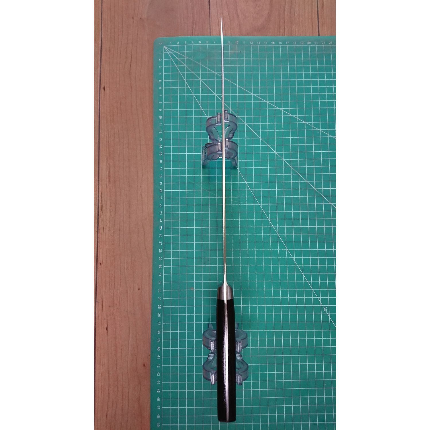 1. o3153/状態:中古/銘:堺刀司/牛刀(両刃 左5:右5 右利き・左利き兼用)/刃長:270/峰厚 アゴ上:2.2/重量:230/作り:ステンレス系/他:ツバの根元から柄全体にかけて樹脂コーティング済み(防サビの為)