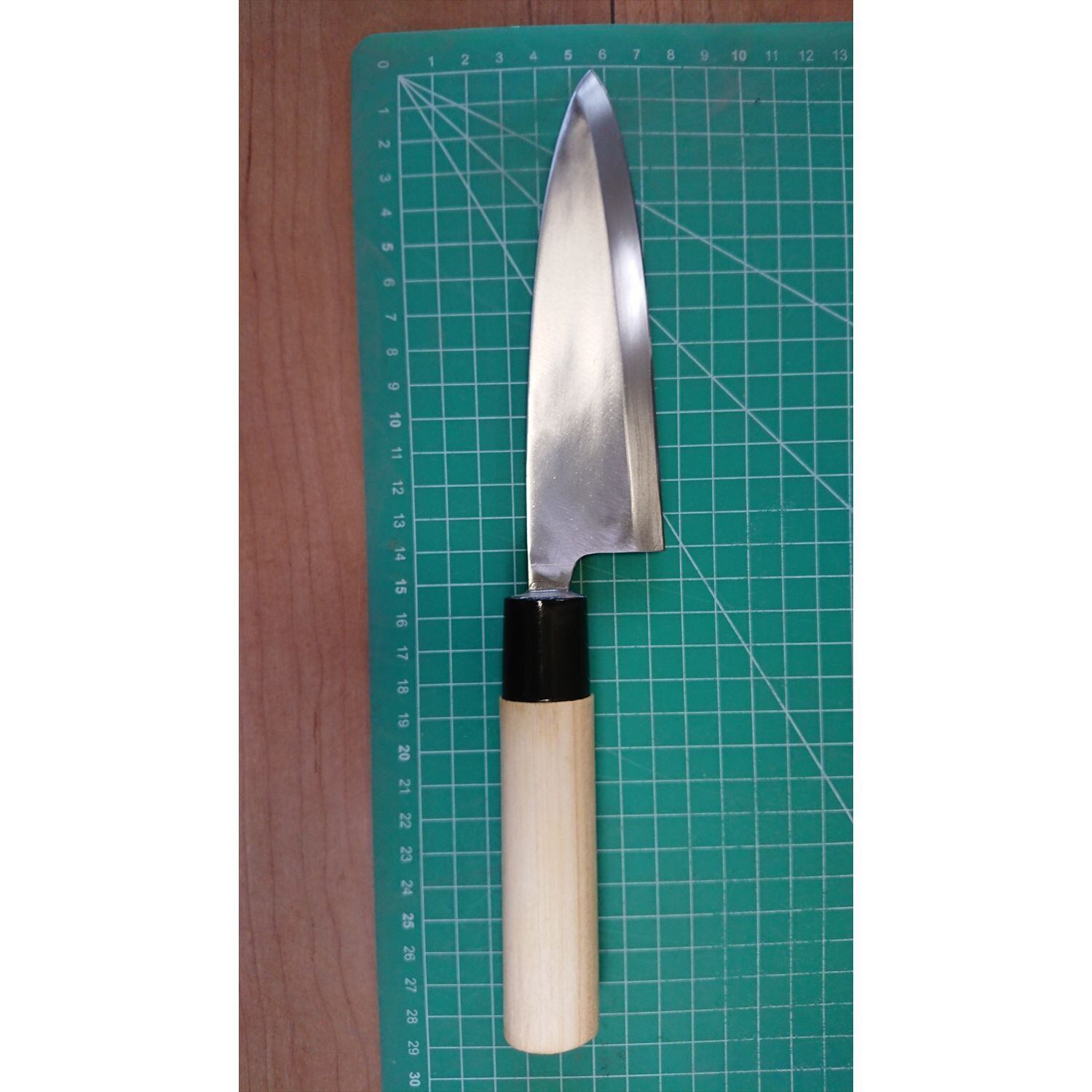 1. o3172/状態:中古/銘:銘?/出刃包丁(片刃 右利き用)/刃長:140/峰厚 アゴ上:5.2/重量:141/作り:鋼/他:柄は当社にて新品と交換済み。ツバの根元から柄全体にかけて樹脂コーティング済み(防サビの為)