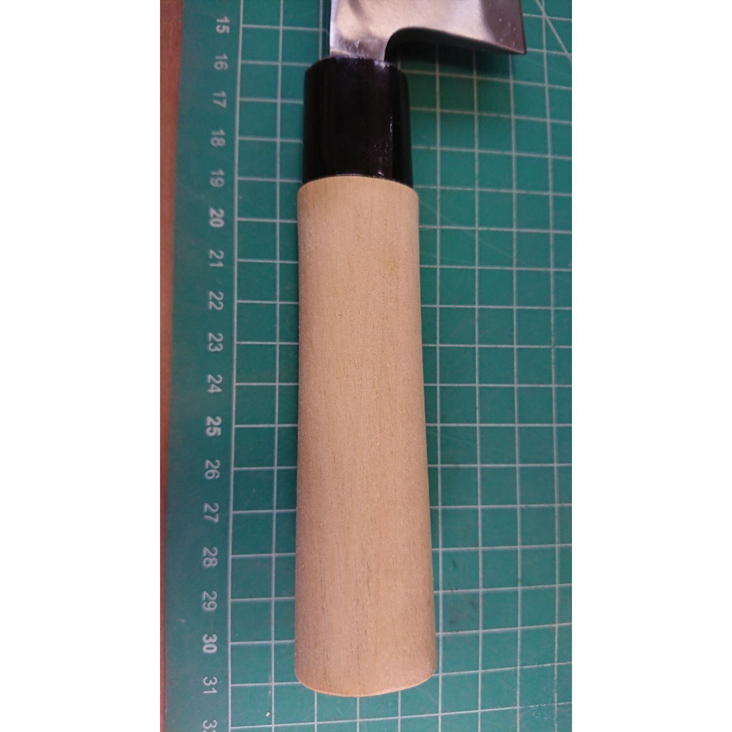 1. o3173/状態:中古/銘:宗久/出刃包丁(片刃 右利き用)/刃長:155/峰厚 アゴ上:8.5/重量:253/作り:鋼/他:柄は当社にて新品と交換済み。ツバの根元から柄全体にかけて樹脂コーティング済み(防サビの為)