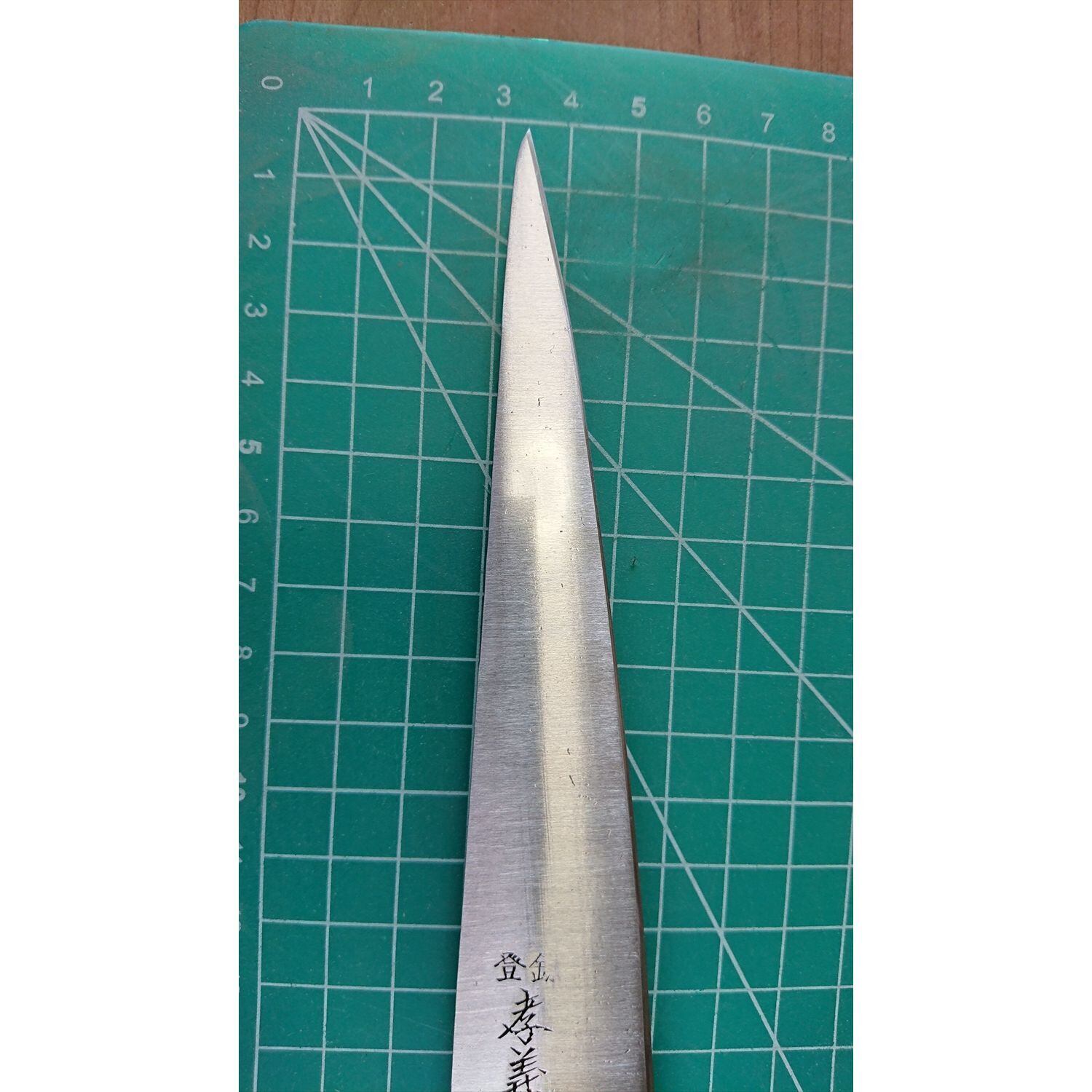 1. o3155/状態:中古/銘:孝義/筋引包丁(両刃 約 左1:右9 右利き用)/刃長:170/峰厚 アゴ上:1.4/重量:123/作り:鋼/他:ツバの根元から柄全体にかけて樹脂コーティング済み(防サビの為)