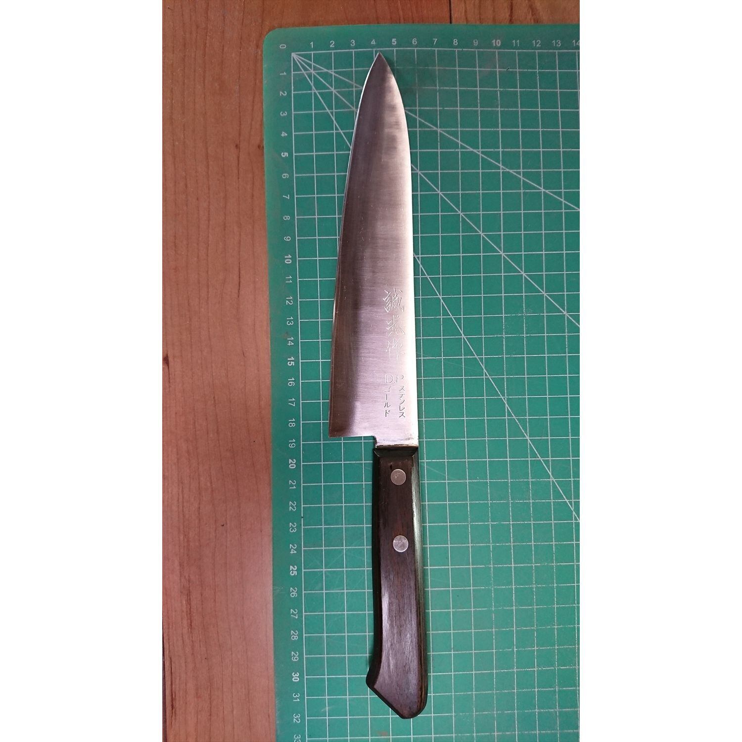 1. o3215/状態:中古/銘:誠光/牛刀(両刃 左5:右5 右利き・左利き兼用)/刃長:185/峰厚 アゴ上:1.8/重量:125/作り:D.PステンレスGOLD(鋼をステンレスでサンド)/他: