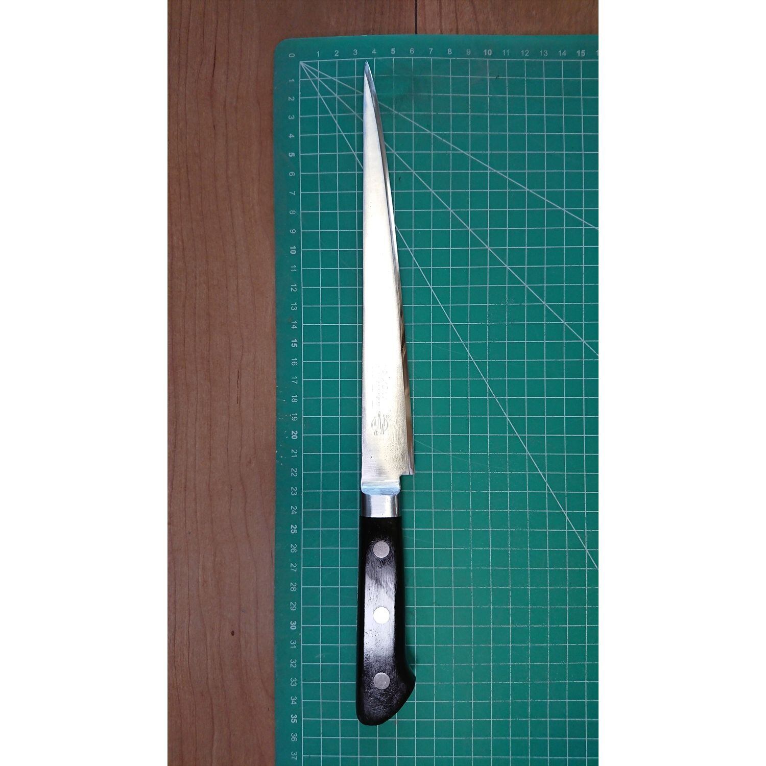 1. o3291/状態:中古/銘:TAKAYUKI(堺孝行)/筋引包丁(両刃 約 左1:右9 右利き用)/刃長:220/峰厚 アゴ上:2.3/重量:172/作り:INOX/他: