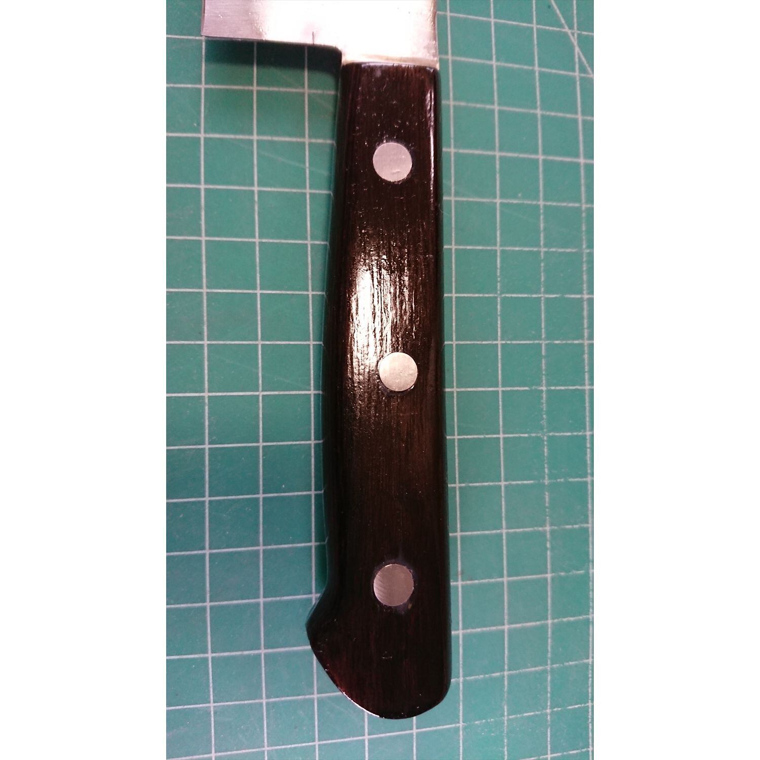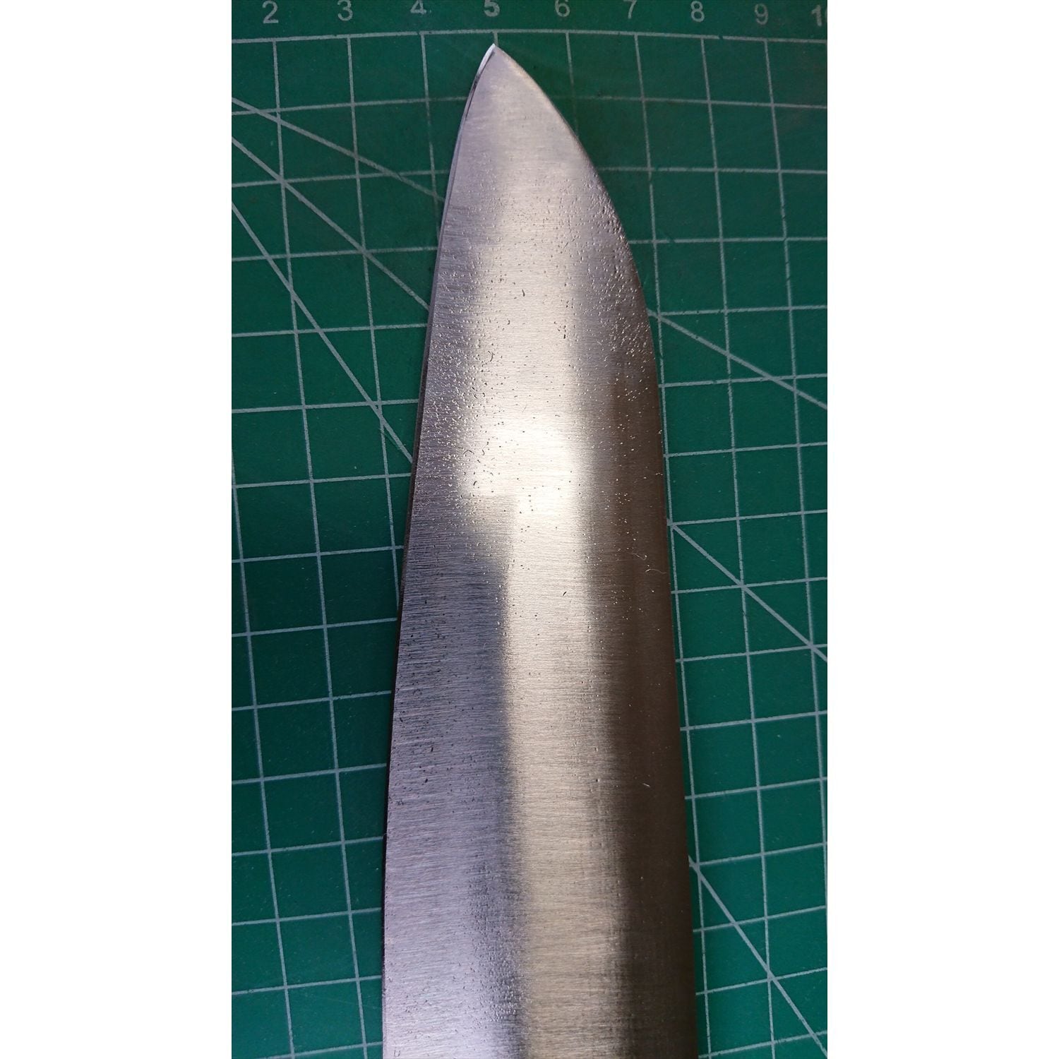 1. o3231/状態:中古/銘:有次/牛刀(両刃 左5:右5 右利き・左利き兼用)/刃長:185/峰厚 アゴ上:1.9/重量:132/作り:鋼/他:柄はオーバーホール済み。ツバの根元から柄全体にかけて樹脂コーティング済み(防サビの為)