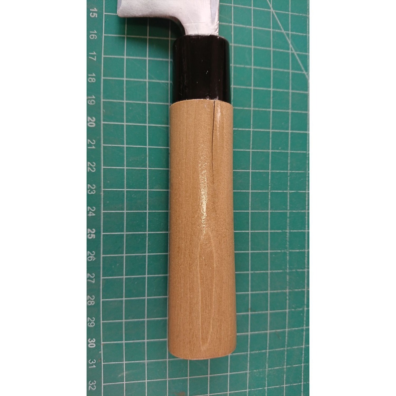 1. o3227/状態:中古/銘:銘?/出刃包丁(片刃 右利き用)/刃長:150/峰厚 アゴ上:7.9/重量:210/作り:鋼/他:ツバの根元から柄全体にかけて樹脂コーティング済み(防サビの為)