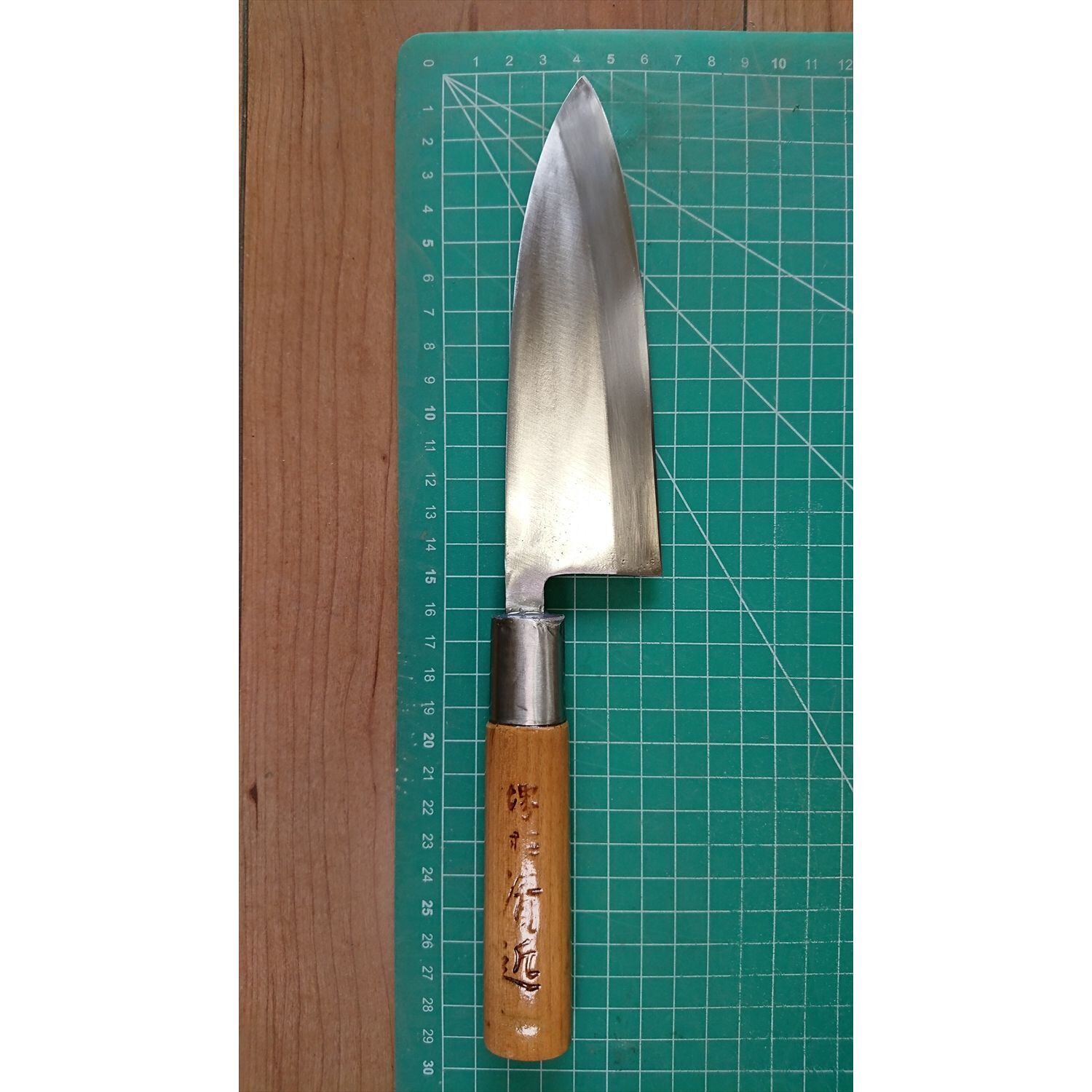 1. o3234/状態:中古/銘:堺?近/出刃包丁(片刃 右利き用)/刃長:150/峰厚 アゴ上:7.7/重量:198/作り:鋼/他:ツバの根元から柄全体にかけて樹脂コーティング済み(防サビの為)