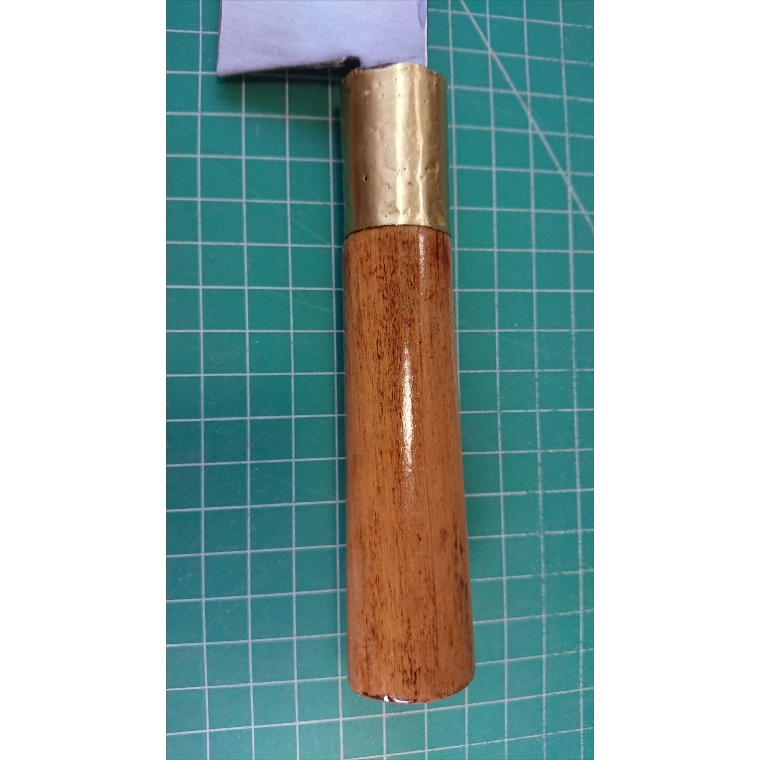 1. o3223/状態:中古/銘:銘?/出刃包丁(片刃 右利き用)/刃長:150/峰厚 アゴ上:8.0/重量:187/作り:鋼/他:ツバの根元から柄全体にかけて樹脂コーティング済み(防サビ防汚の為)