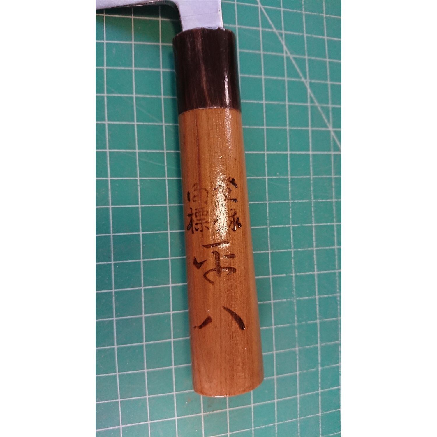 1. o3229/状態:中古/銘:平八/出刃包丁(片刃 右利き用)/刃長:145/峰厚 アゴ上:6.7/重量:193/作り:鋼 水牛柄/他:ツバの根元から柄全体にかけて樹脂コーティング済み(防サビ防汚の為)