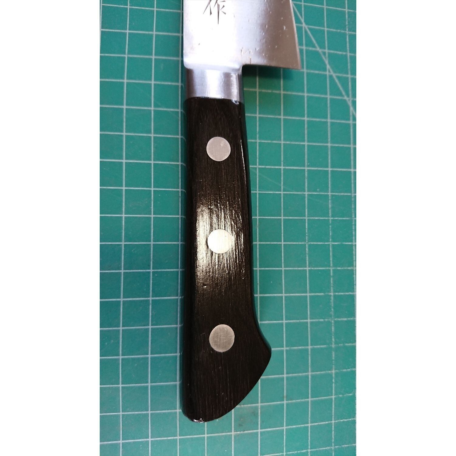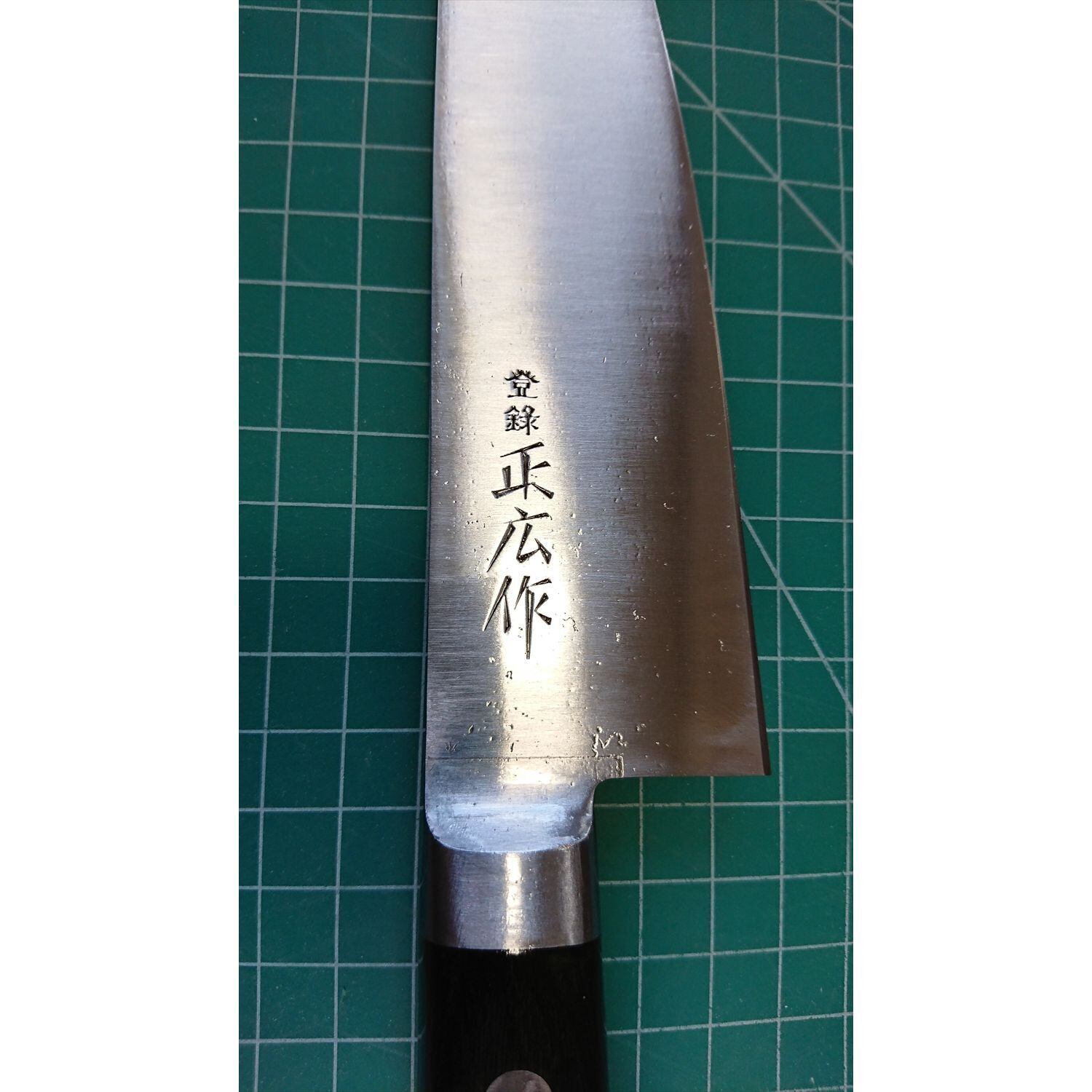 1. o3267/状態:中古/銘:正広/三徳包丁(両刃 左5:右5 右利き・左利き兼用)/刃長:165/峰厚 アゴ上:1.5/重量:154/作り:鋼/他:ツバの根元から柄全体にかけて樹脂コーティング済み(防サビ防汚の為)