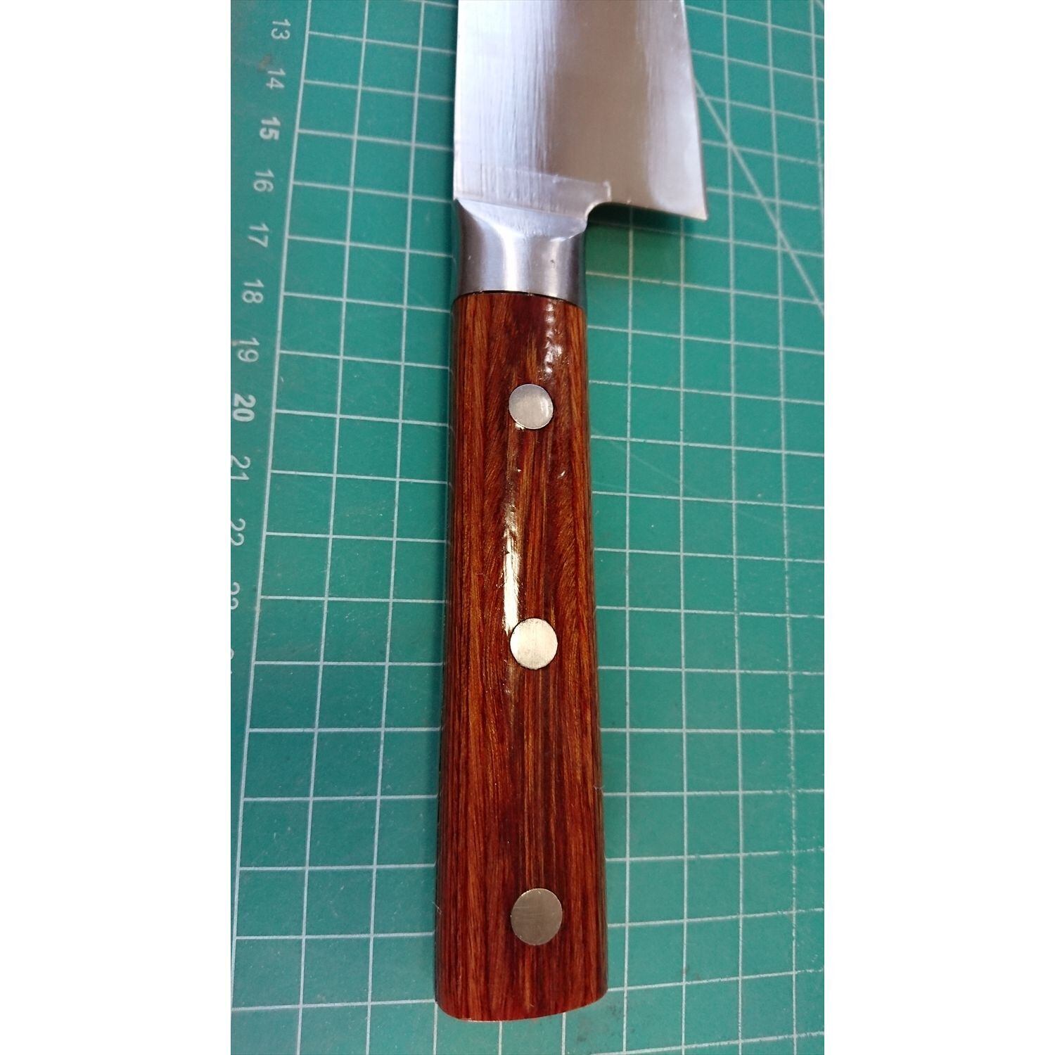 1. o3263/状態:中古/銘:剣正宗/三徳包丁(両刃 左5:右5 右利き・左利き兼用)/刃長:160/峰厚 アゴ上:1.8/重量:143/作り:モリブデン鋼/他:ツバの根元から柄全体にかけて樹脂コーティング済み(防サビ防汚の為)