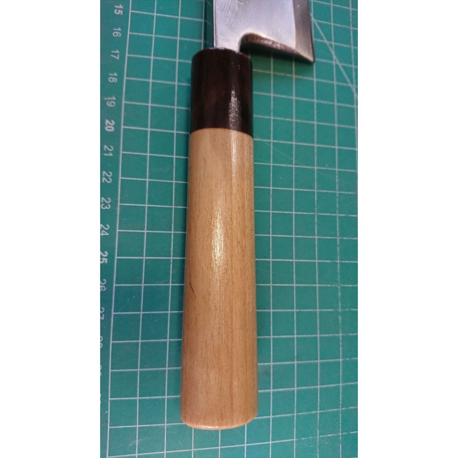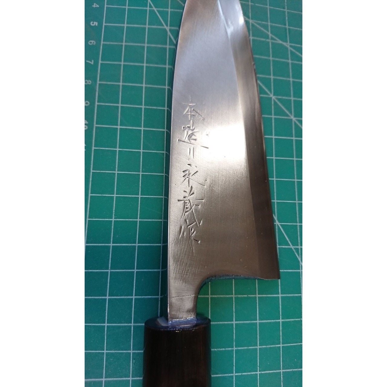 1. o3307/状態:中古/銘:本造り 永蔵/出刃包丁(片刃 右利き用)/刃長:165/峰厚 アゴ上:8.4/重量:255/作り:安来白鋼 水牛柄/他:ツバの根元から柄全体にかけて樹脂コーティング済み(防サビ防汚の為)
