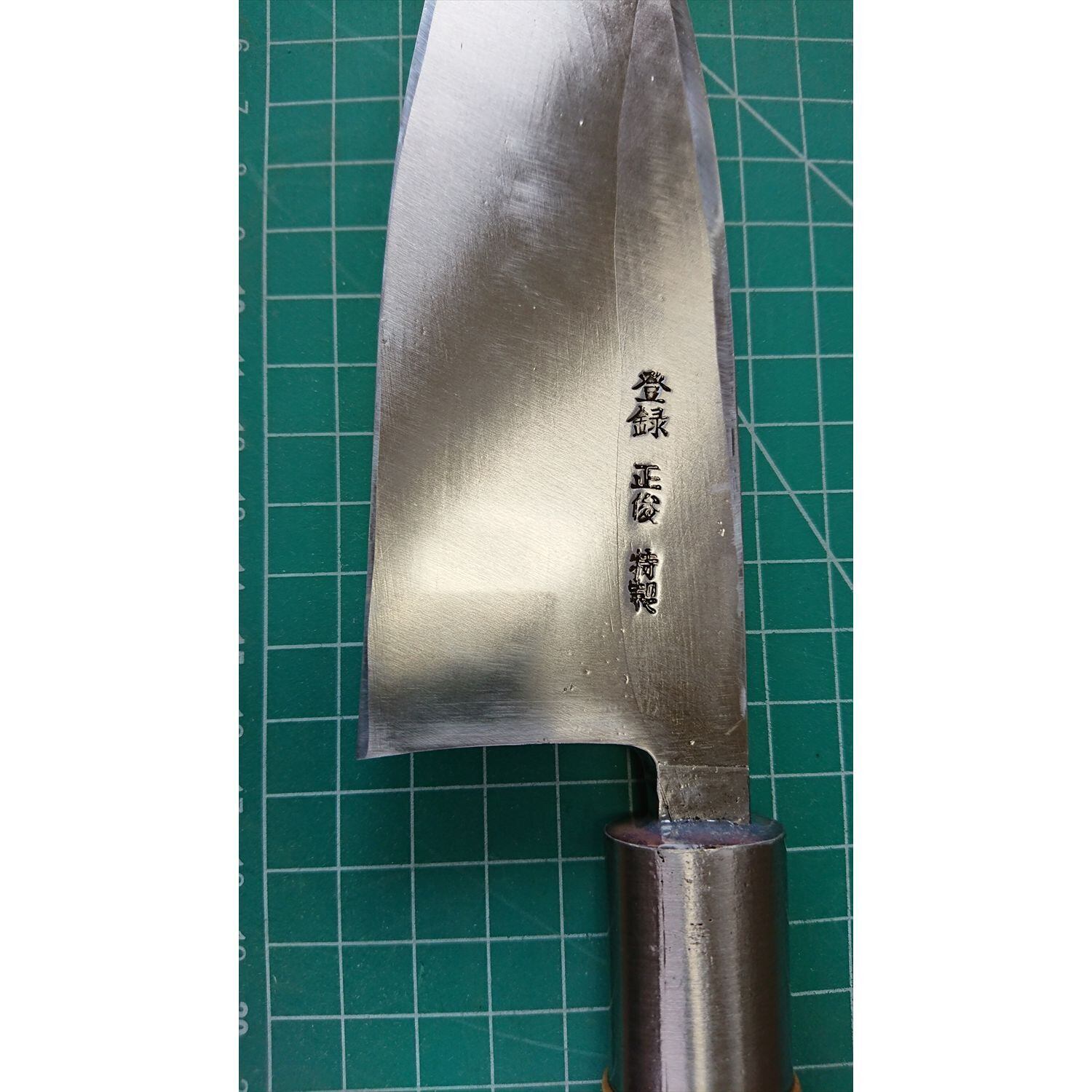 1. o3282/状態:中古/銘:正俊/出刃包丁(片刃 右利き用)/刃長:160/峰厚 アゴ上:8.4/重量:241/作り:鋼/他:ツバの根元から柄全体にかけて樹脂コーティング済み(防サビ防汚の為)