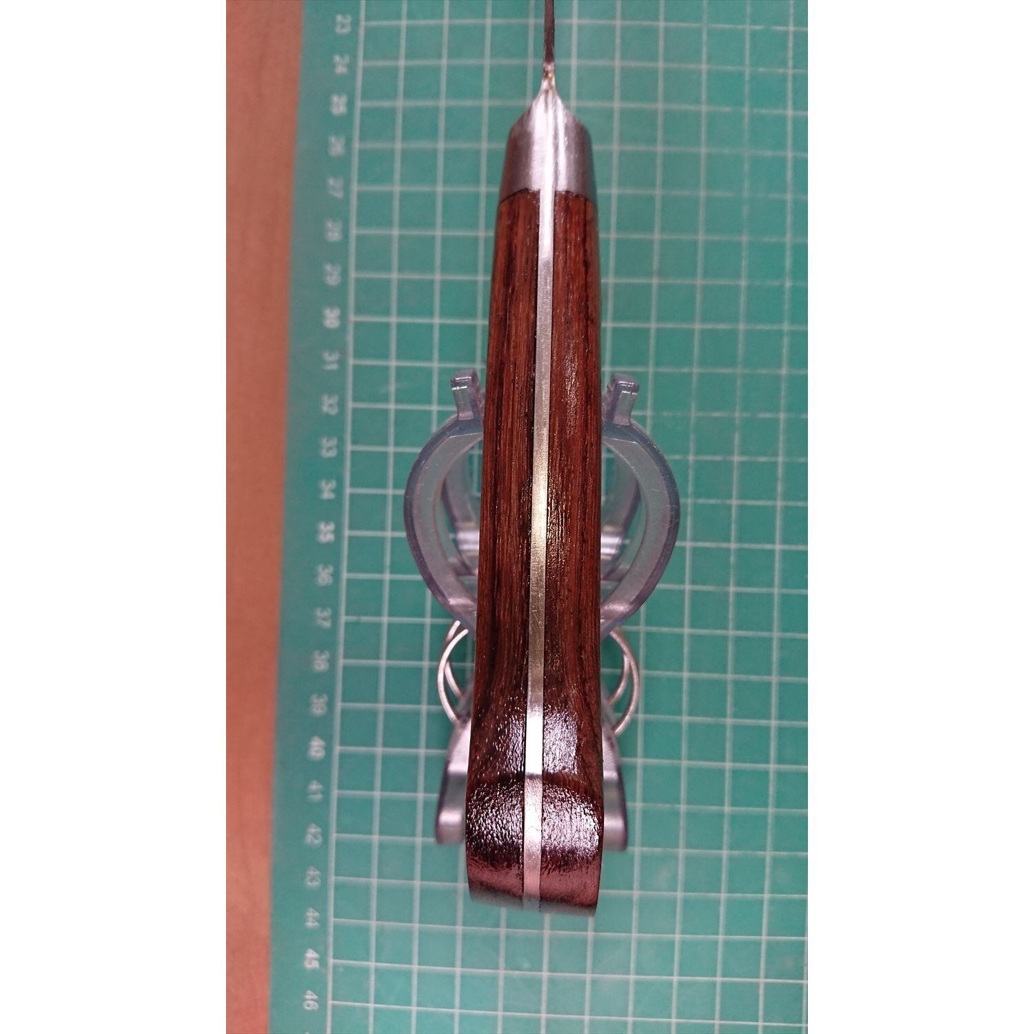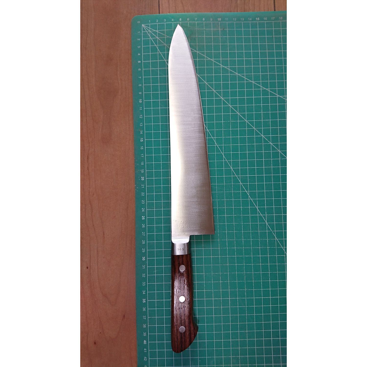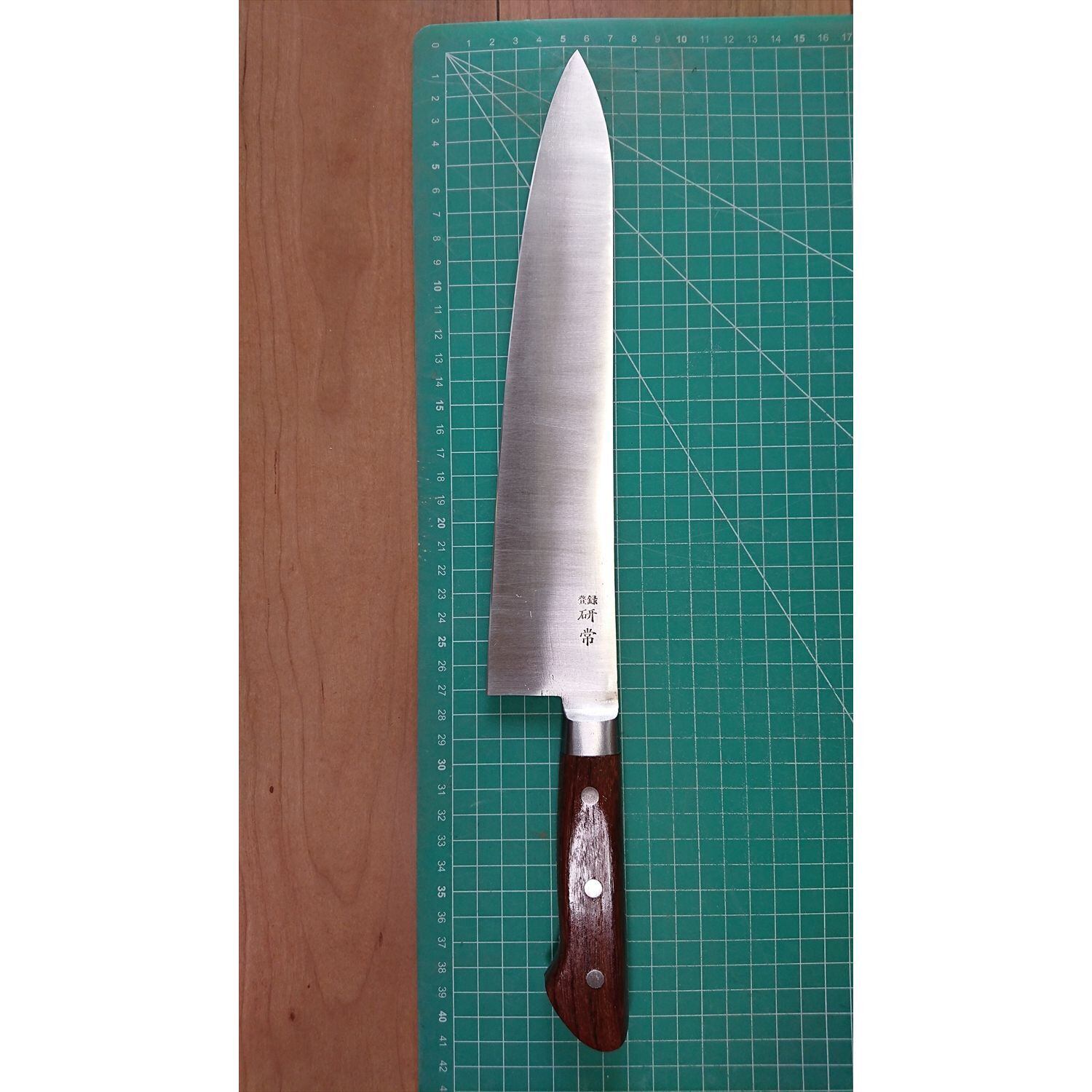 1. o3297/状態:中古/銘:研常/牛刀(両刃 左5:右5 右利き・左利き兼用)/刃長:275/峰厚 アゴ上:2.1/重量:220/作り:鋼/他:ツバの根元から柄全体にかけて樹脂コーティング済み(防サビ防汚の為)