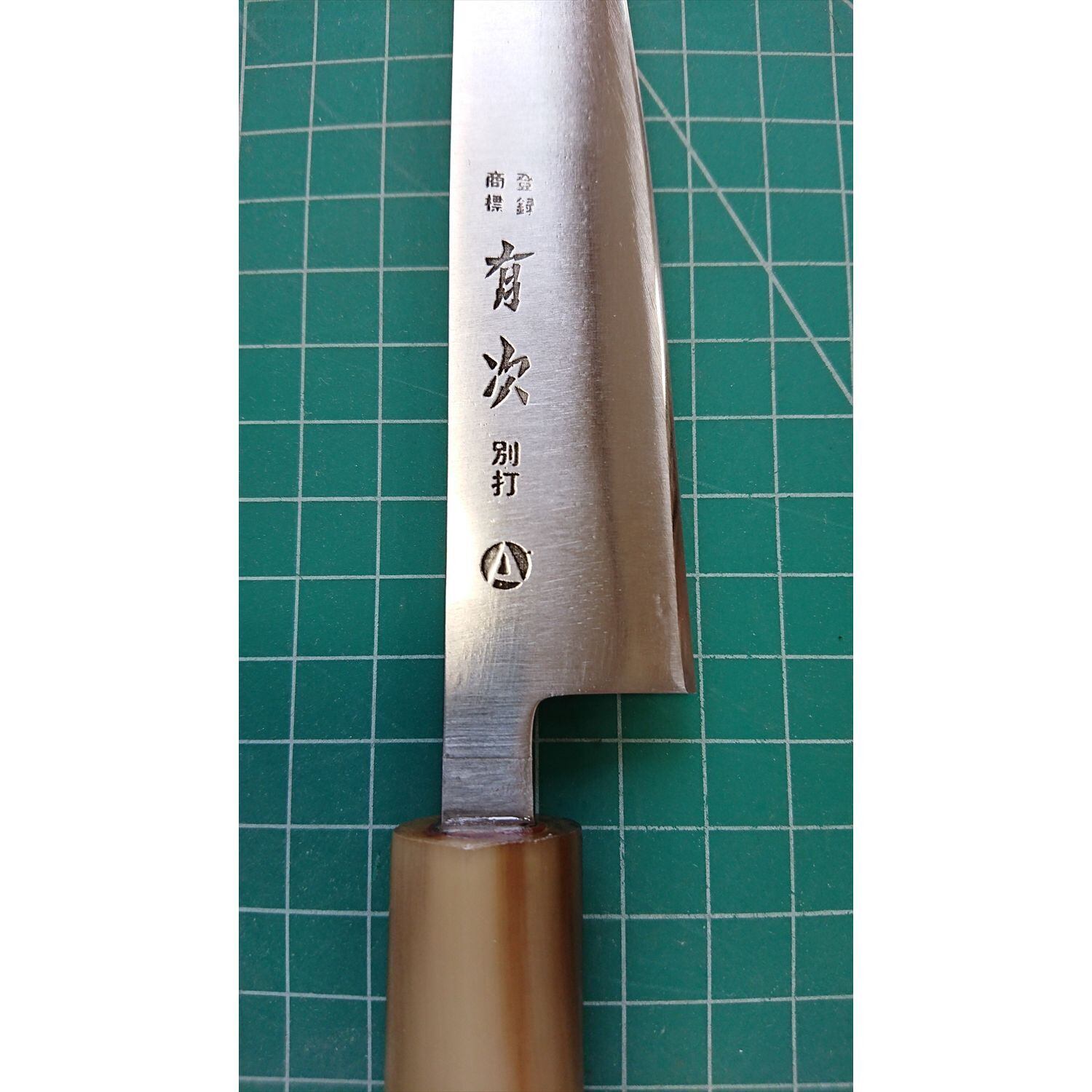 1. o3317/状態:中古/銘:有次 別打/牛刀(両刃 約 左3:右7 右利き用)/刃長:175/峰厚 アゴ上:1.7/重量:67/作り:合金鋼 水牛柄/他:ツバの根元から柄全体にかけて樹脂コーティング済み(防サビ防汚の為)