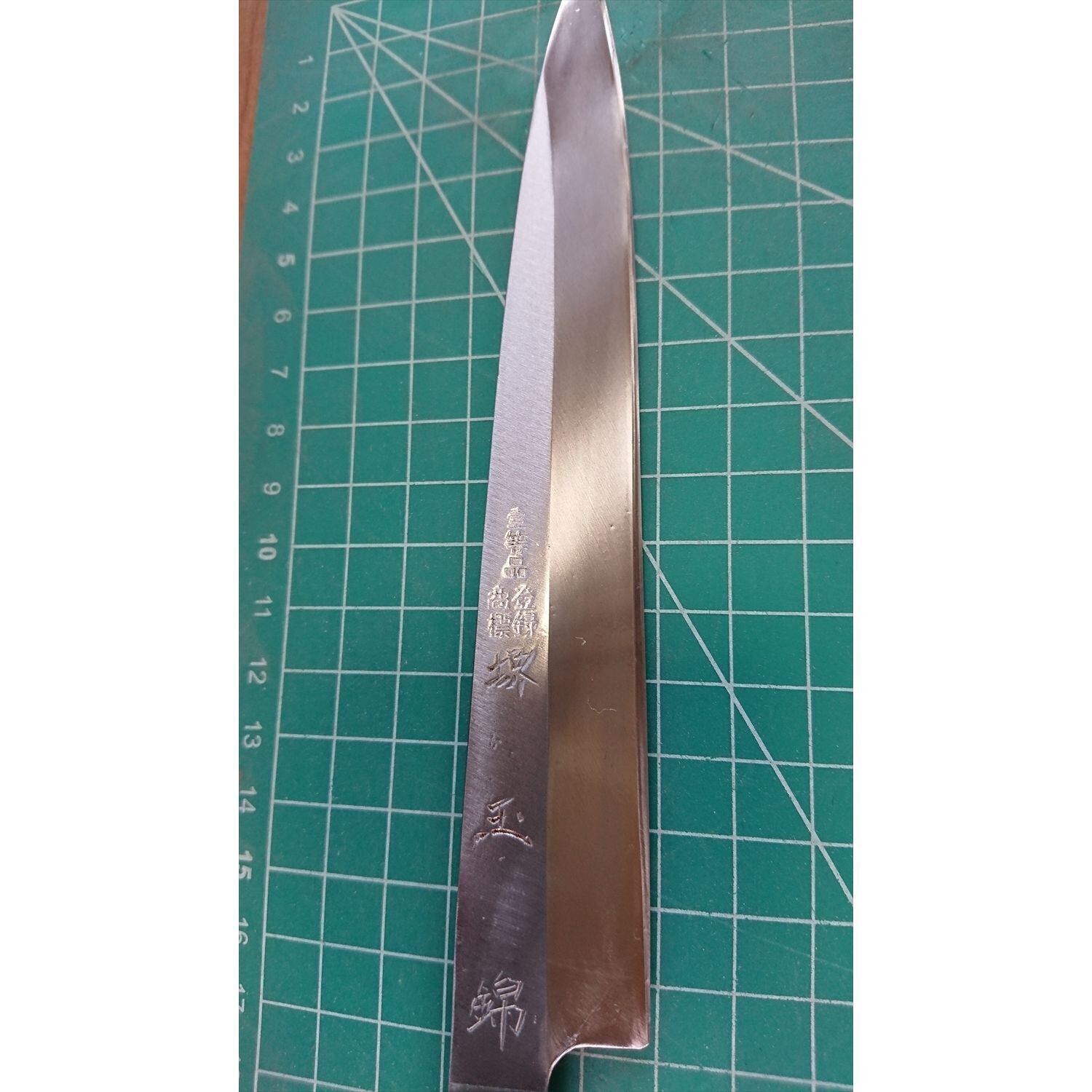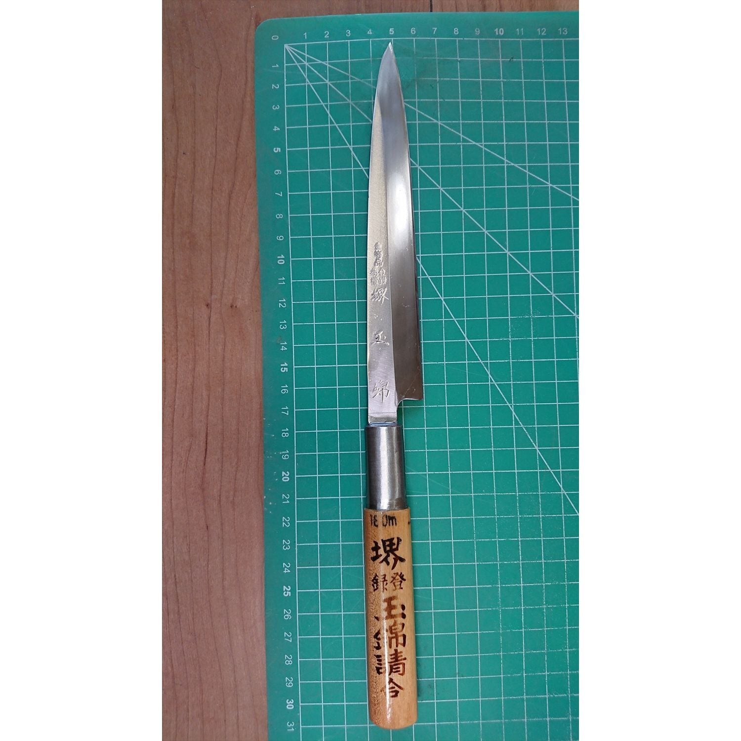 1. o3311/状態:中古/銘:堺玉錦/刺身包丁(片刃 右利き用)/刃長:170/峰厚 アゴ上:3.1/重量:83/作り:鋼/他:ツバの根元から柄全体にかけて樹脂コーティング済み(防サビ防汚の為)