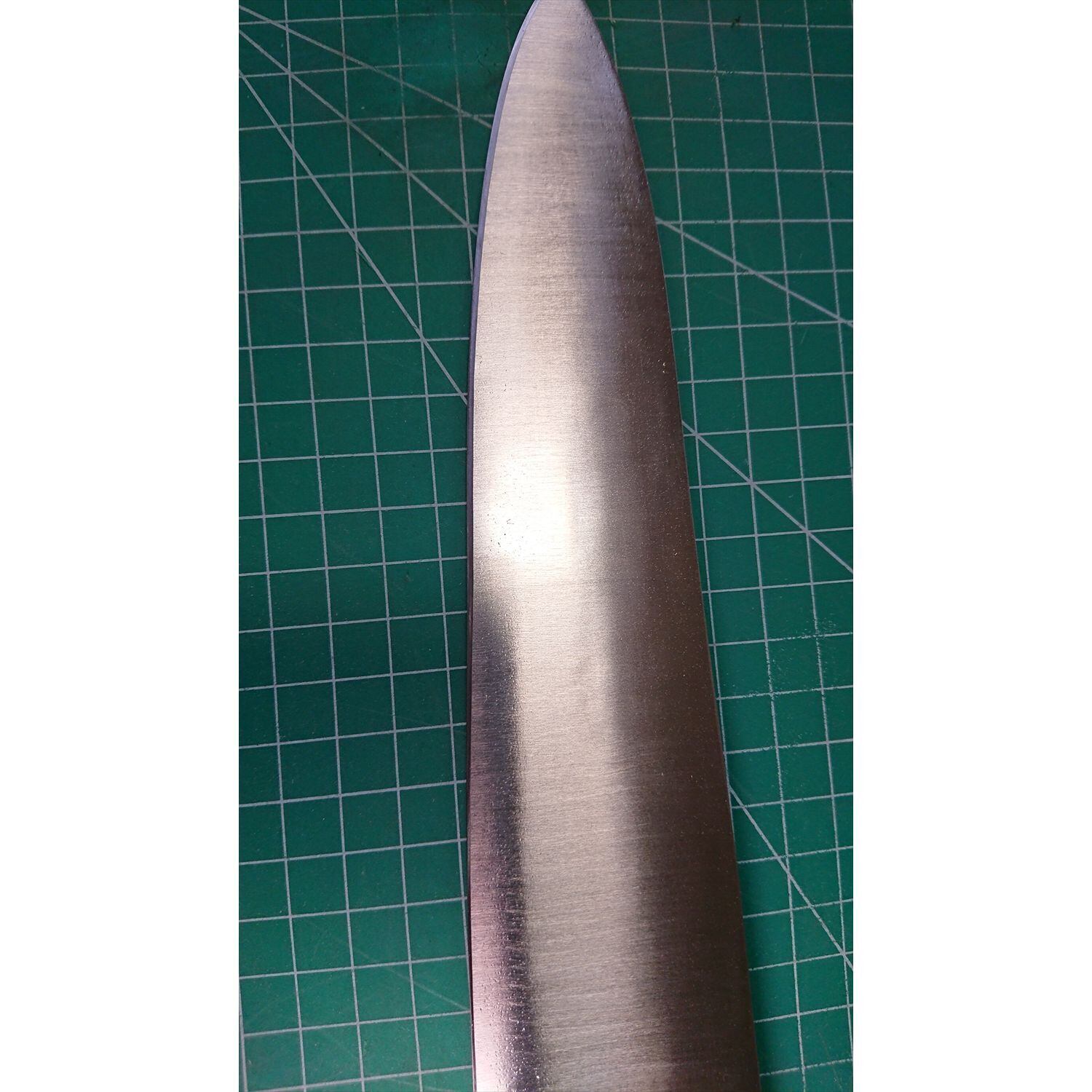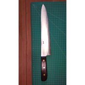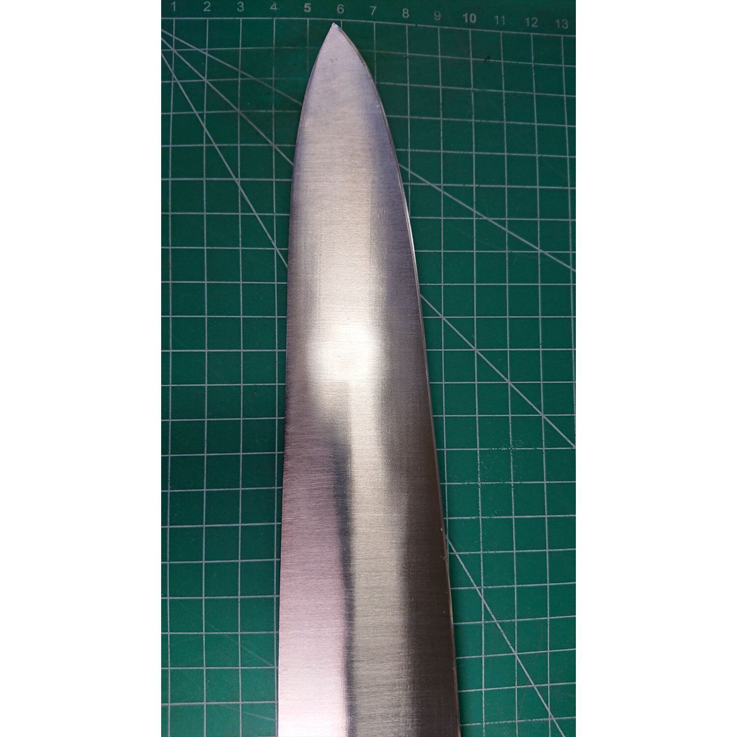 1. o3281/状態:中古/銘:助磨/牛刀(両刃 左5:右5 右利き・左利き兼用)/刃長:290/峰厚 アゴ上:1.9/重量:239/作り:安来鋼/他:ツバの根元から柄全体にかけて樹脂コーティング済み(防サビ防汚の為)